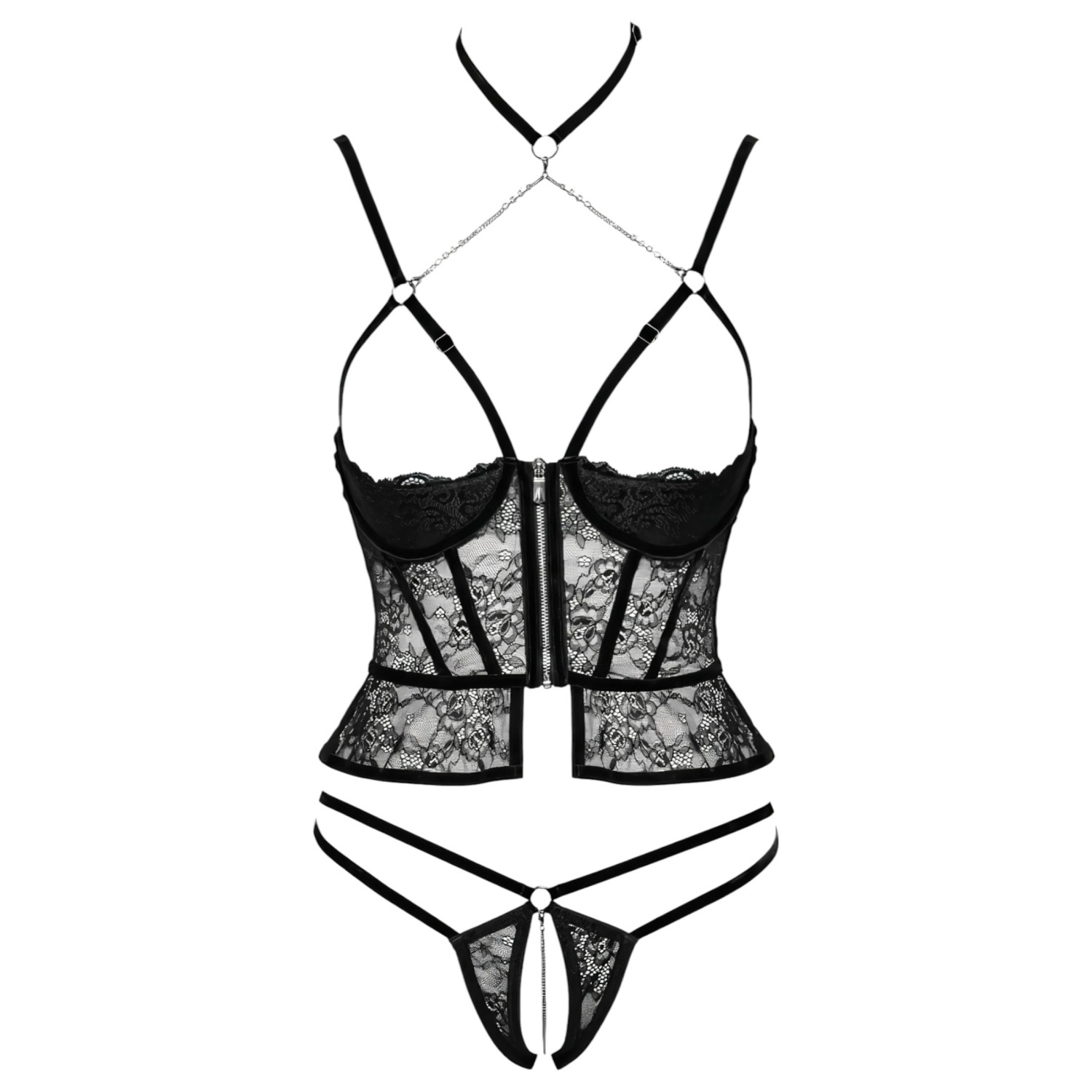 La matière en dentelle douce offre un confort optimal tout en mettant sensuellement en valeur la féminité. La sous-bande avec armature sous la poitrine assure un bon maintien, tandis que le design zippé au centre est à la fois pratique et sexy. Le string entièrement ouvert avec chaîne argentée est extrêmement séduisant, tandis que le tour de cou amovible avec détails en pierres précieuses ajoute une touche luxueuse.