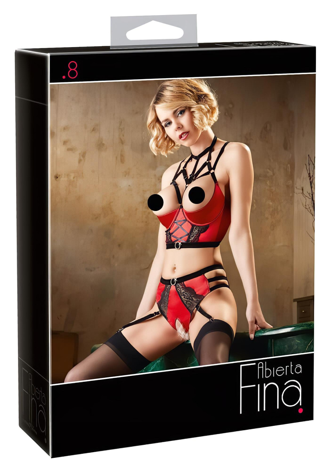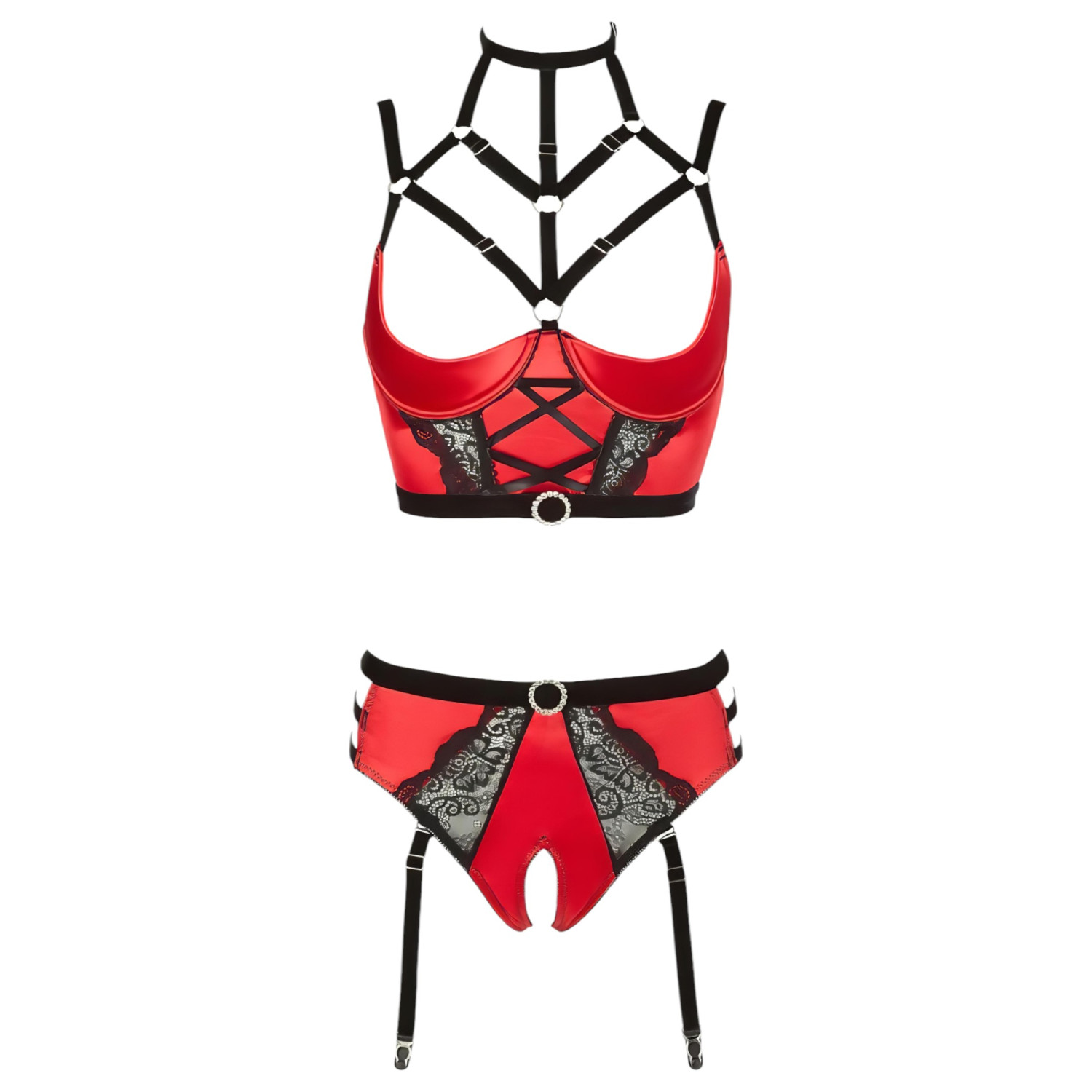 Ensemble de lingerie imposant et irrésistible dans un style audacieux et élégant, rendu vraiment unique par ses détails à lanières, sa dentelle noire et ses strass scintillants - Ensemble avec soutien-gorge à anneaux Abierta Fina !