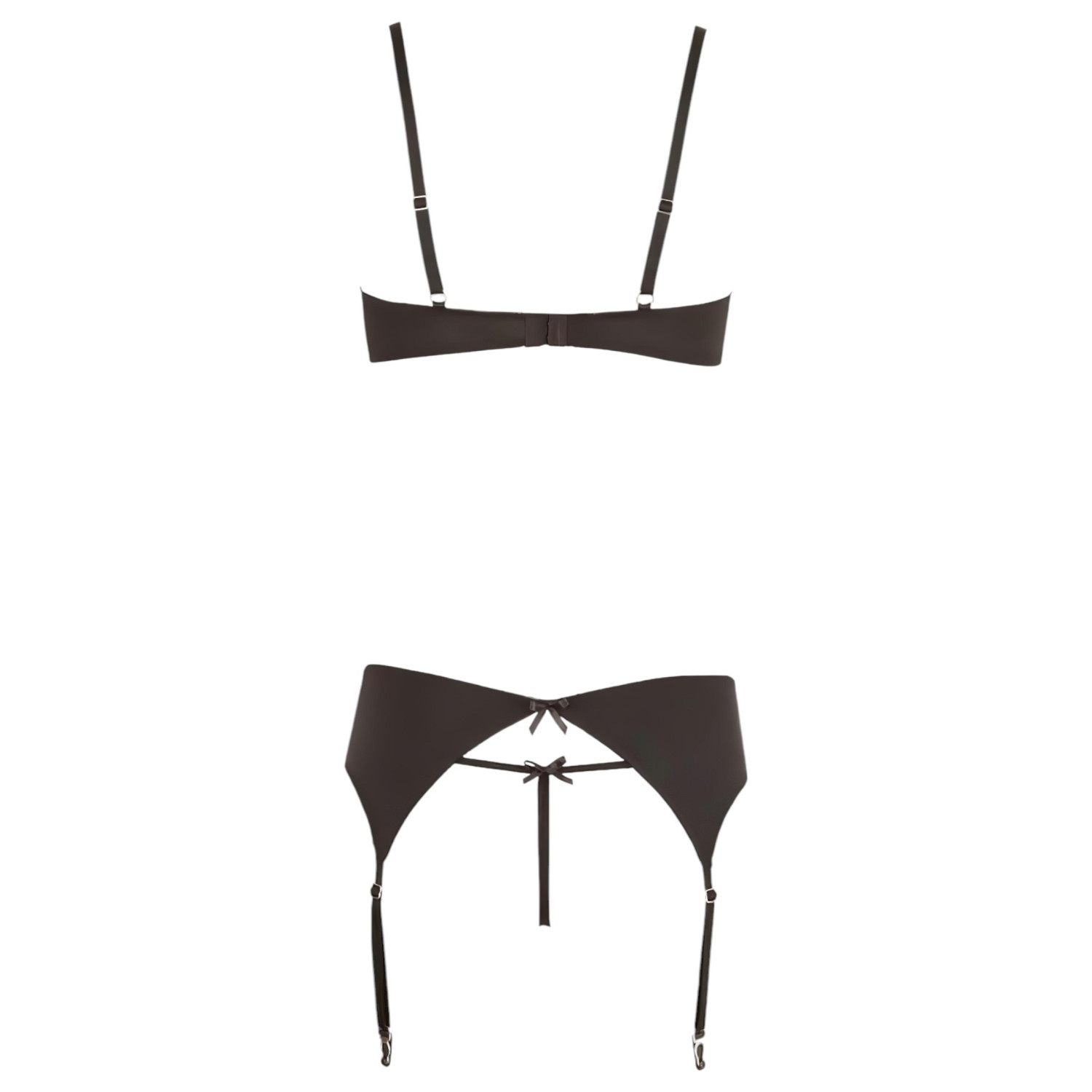 Enfilez le rehausse-seins à bretelles réglables qui met en valeur et soulève la poitrine. Complétez l'ensemble avec le string ouvert, puis fixez le porte-jarretelles à vos bas préférés. Vous ressentirez immédiatement l'effet spécial et sensuel.