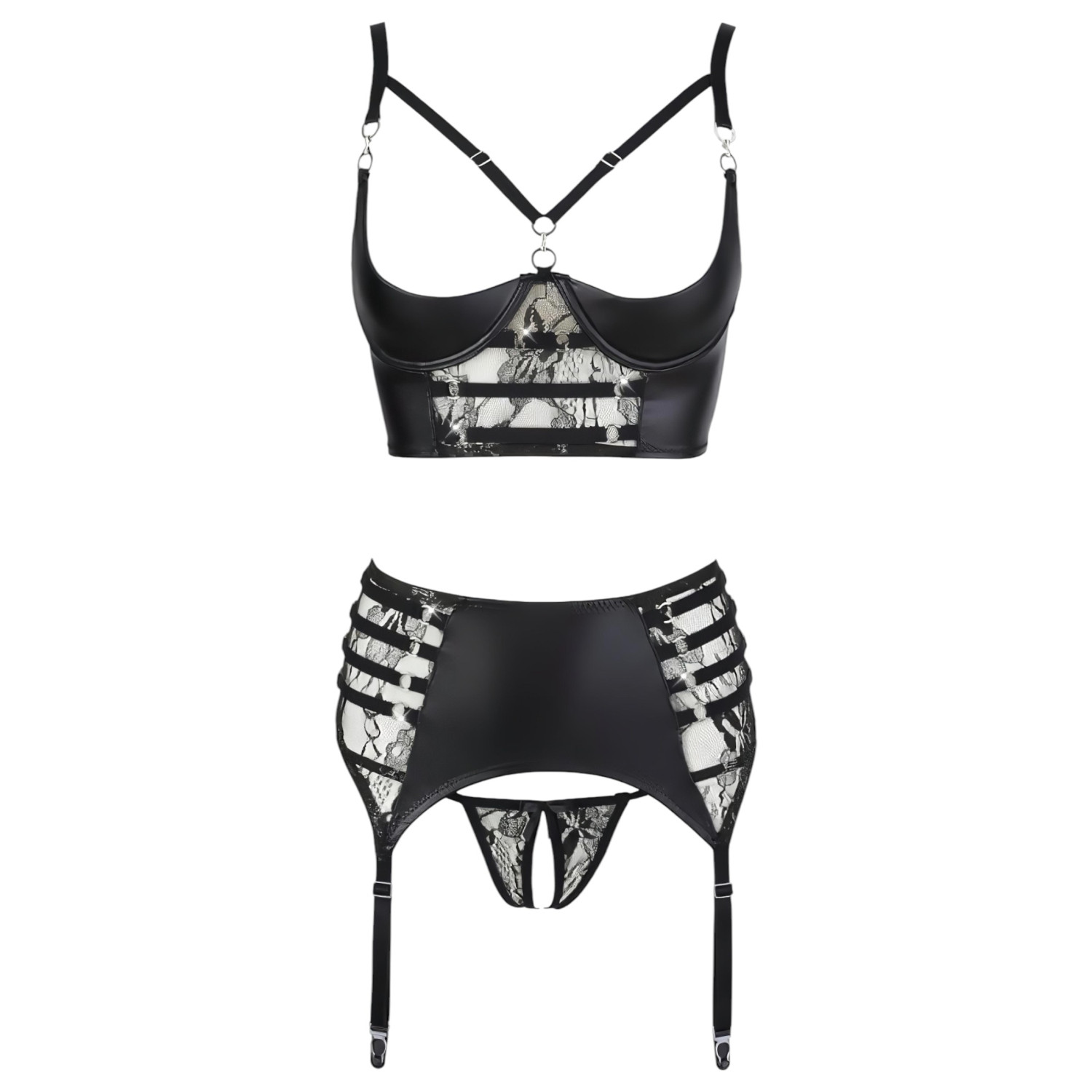 Audacieux ensemble de lingerie premium, qui rendra ton look inoubliable grâce à une dentelle sensuelle, des éléments métalliques scintillants et des bandes raffinées !