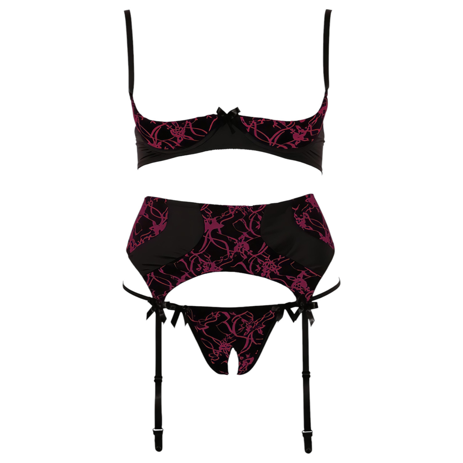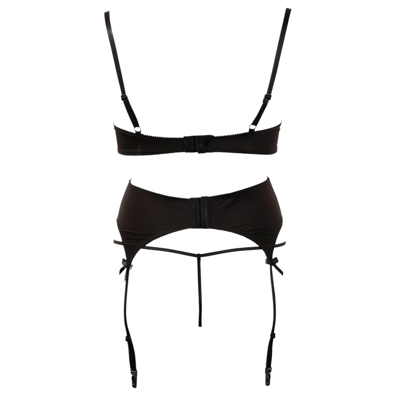 Enfilez le soutien-gorge, ajustez les bretelles pour un ajustement parfait, puis fixez le porte-jarretelles avec vos bas préférés. Complétez enfin l'ensemble avec la culotte ouverte – et obtenez ainsi un look séduisant et romantique.