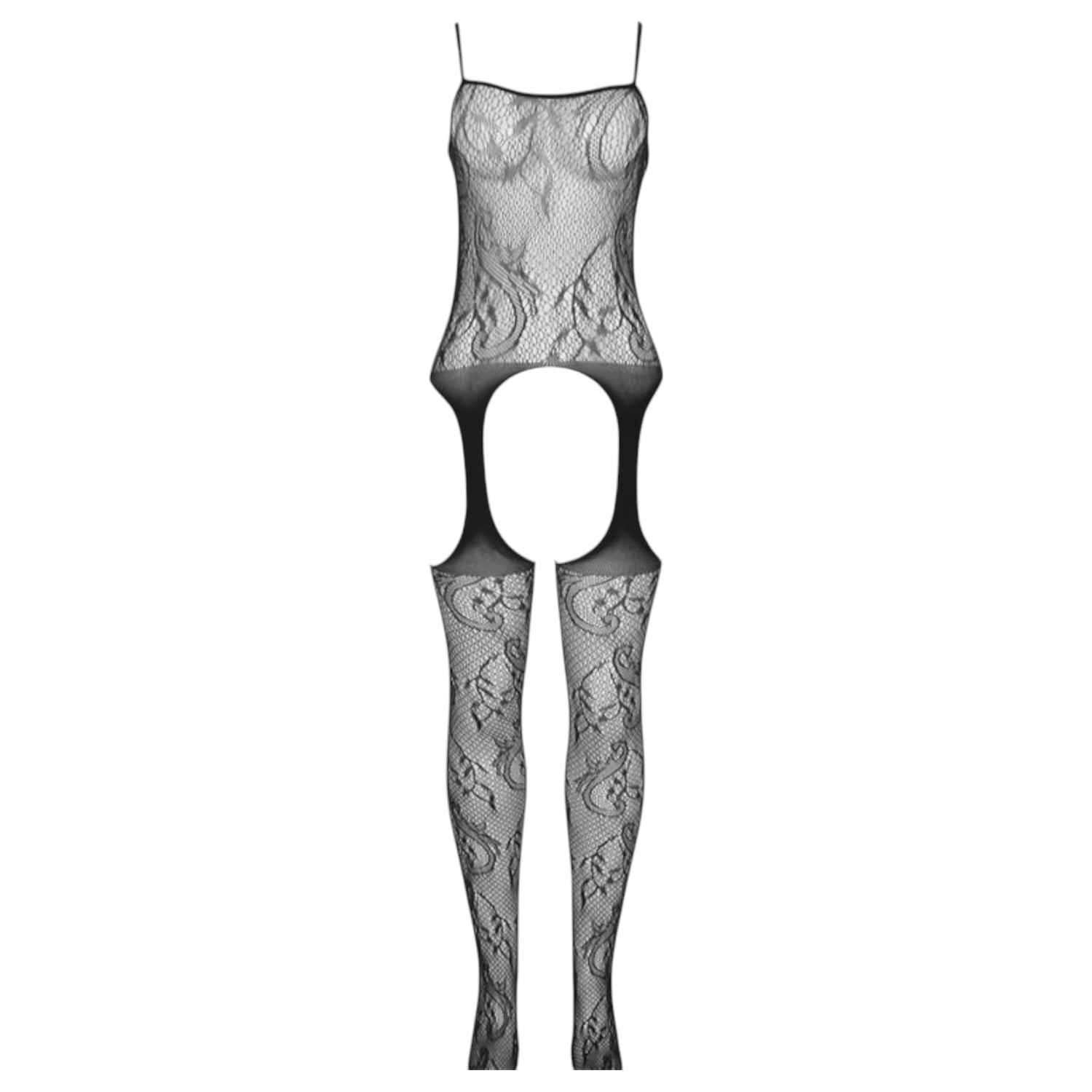 • 1 bodystocking Lilly en résille à motif fleuri, avec porte-jarretelles intégré et partie inférieure ouverte (sans string)