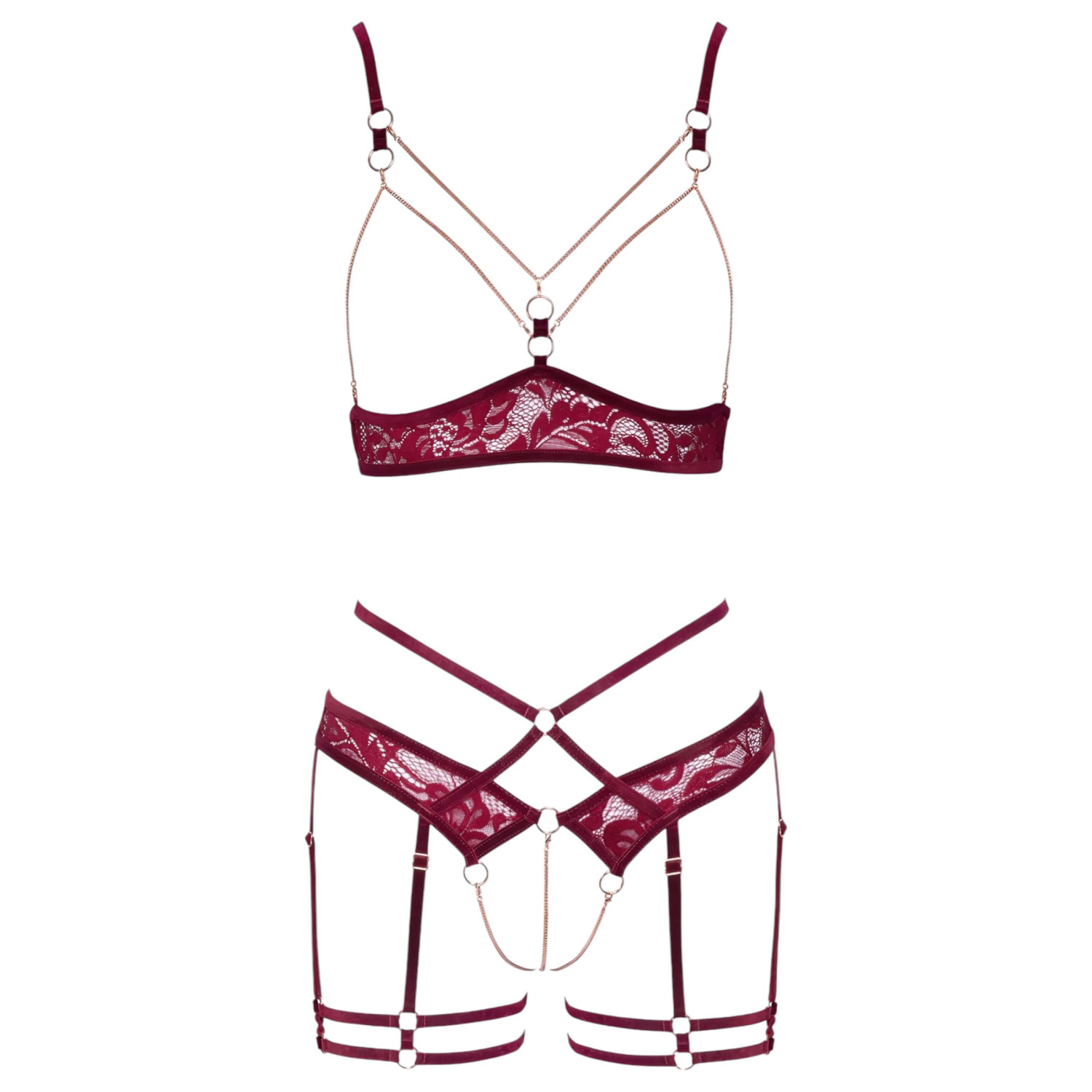 Ce set audacieux est le choix parfait pour celles qui souhaitent montrer leur féminité sous sa forme la plus séduisante. La conception ouverte, la dentelle délicate et les détails en chaîne spéciaux garantissent un effet irrésistible.