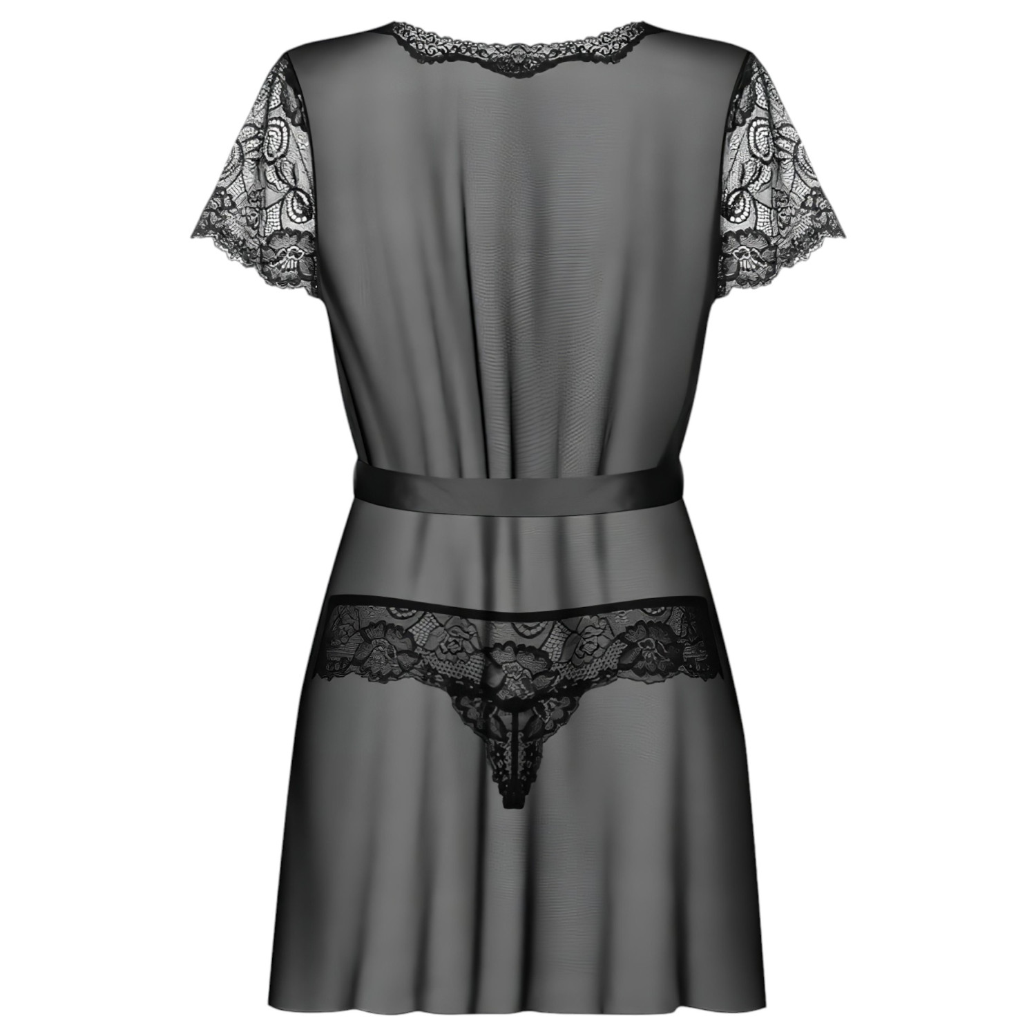 • 1 peignoir transparent avec détails en dentelle et ceinture satinée