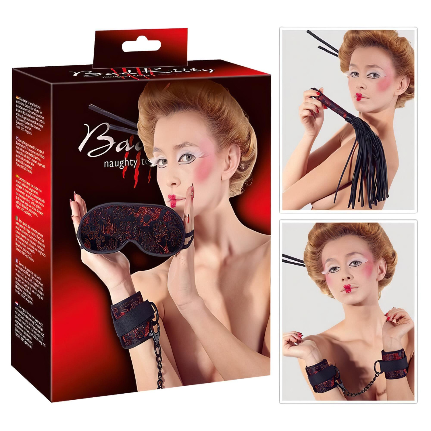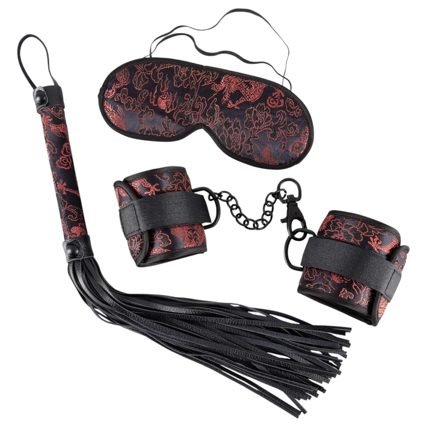 Découvre de nouvelles dimensions de plaisir avec ce set bondage élégant en trois pièces, confectionné en satin noir orné de motifs rouges.