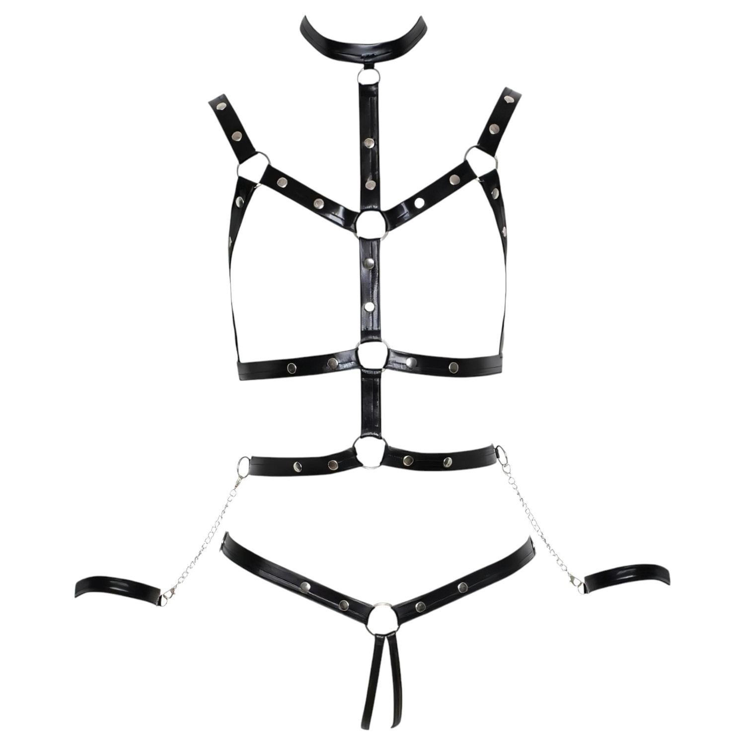 Découvre l’univers de la séduction et du bondage avec ce body harnais unique en deux parties, orné de clous décoratifs.