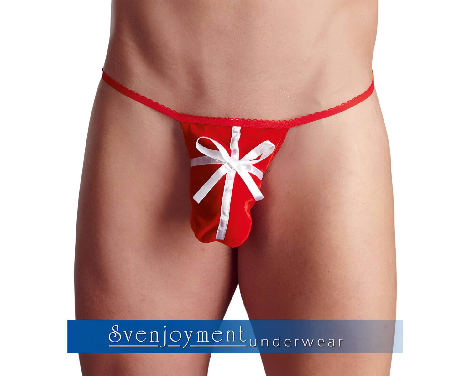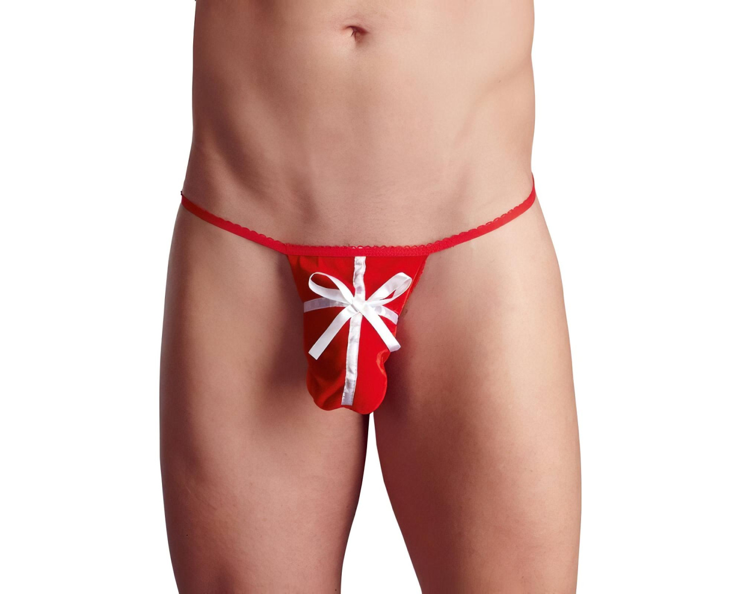 Offre-toi en cadeau - littéralement ! Un string pour homme en velours rouge avec un nœud, pour être la surprise la plus sexy de la soirée !