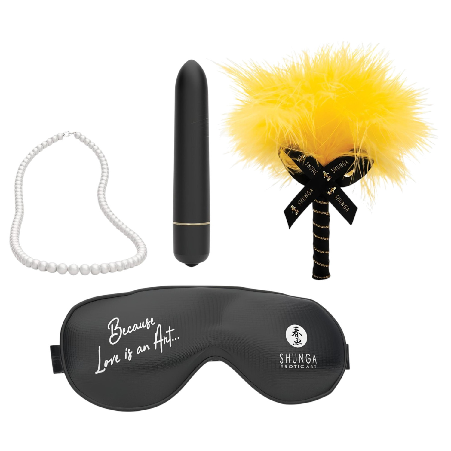 • 4 accessoires ludiques – mini vibromasseur, chaîne perlée, masque pour les yeux et plume pour des soirées excitantes.