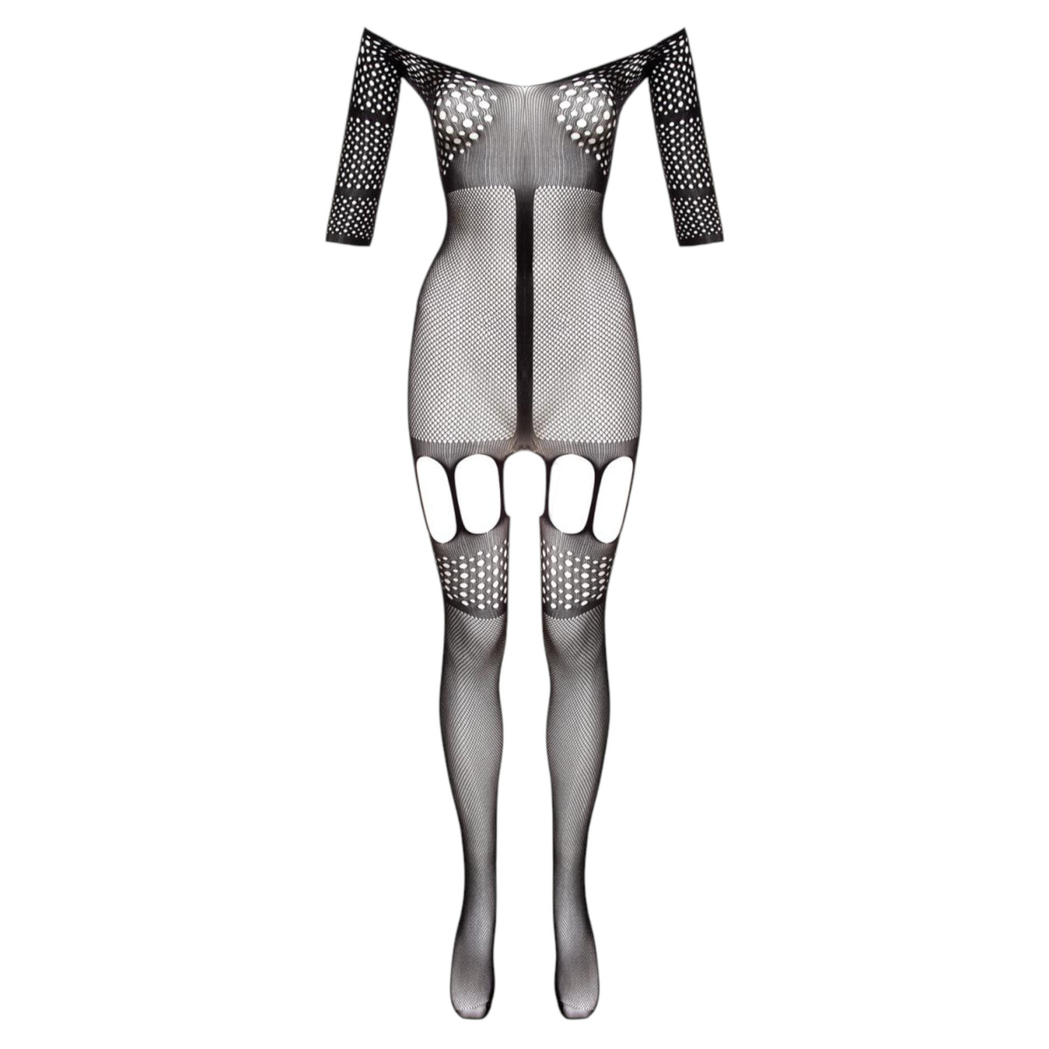 Ce body noir à manches longues avec un motif résille moderne, une ouverture à l’entrejambe et des détails façon porte-jarretelles va te faire craquer à coup sûr.
