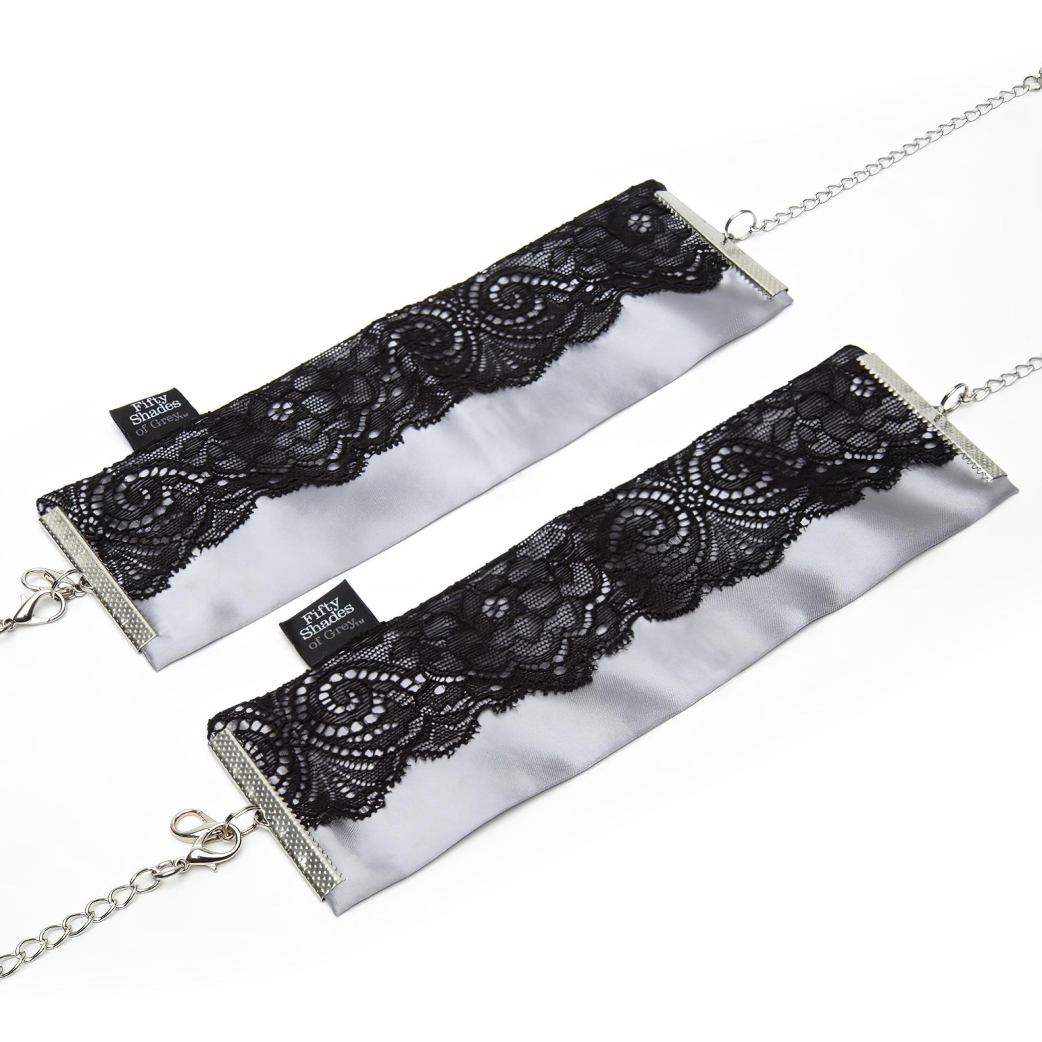 Envie de jeu sensuel ? Découvre cette paire de menottes en satin argenté ornées d’une jolie dentelle noire.