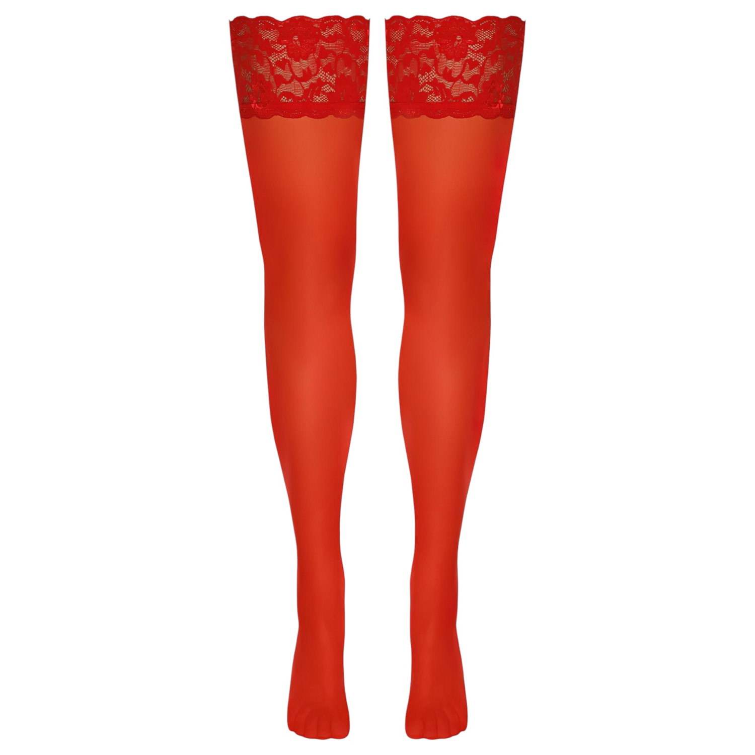 • 1 paire de bas rouges, bordure dentelle 9 cm et bande silicone