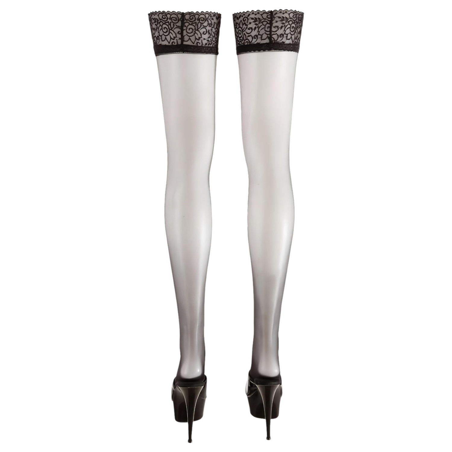 Bas résille transparente, montante jusqu’à la cuisse, avec large bordure en dentelle.