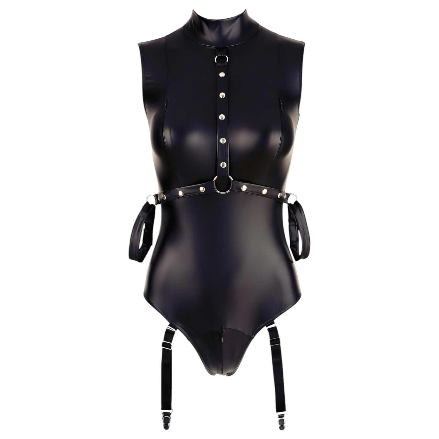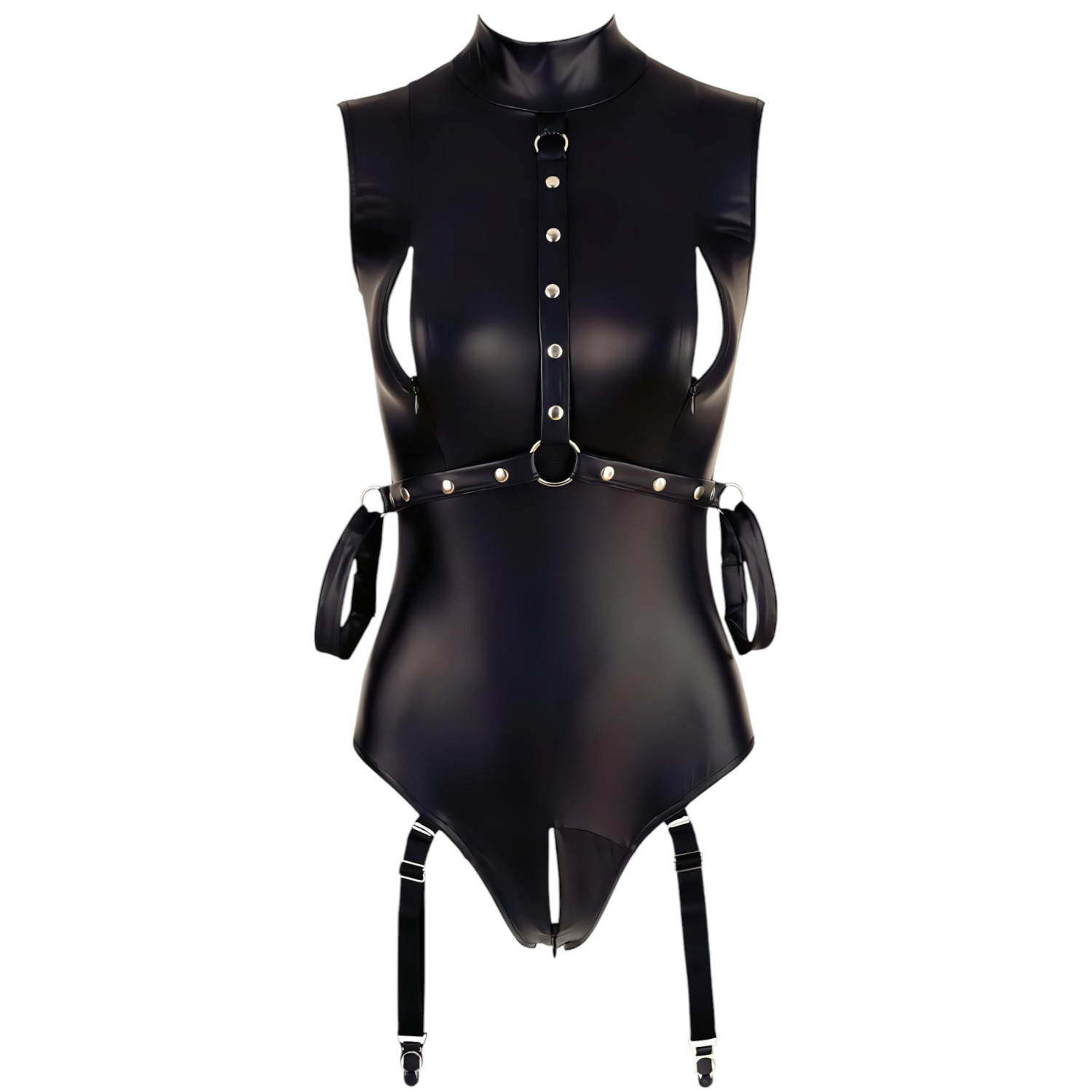 • 1 body brillant effet cuir façon porte-jarretelles avec menottes intégrées