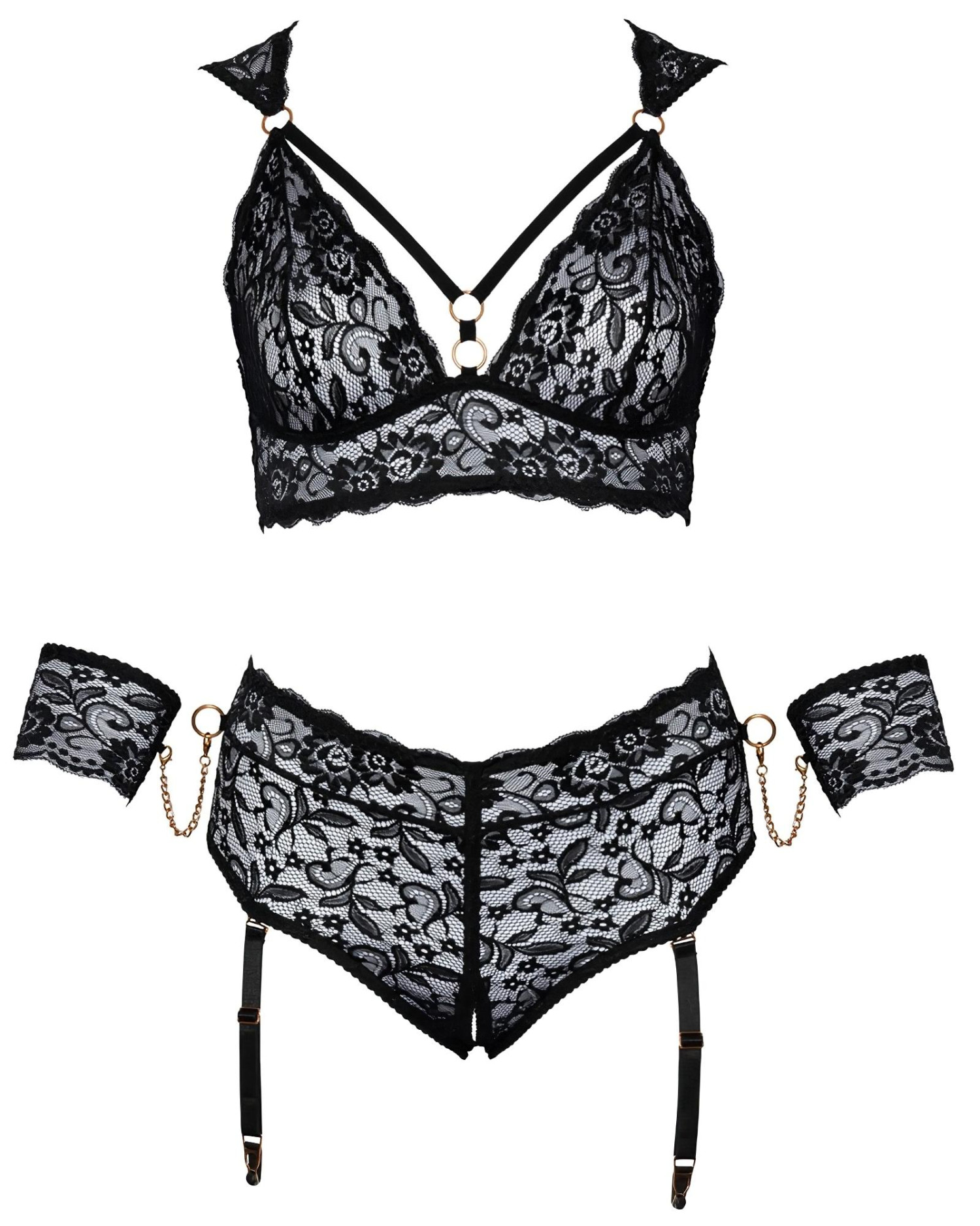 Un ensemble de lingerie audacieux et féminin, spécialement pensé pour sublimer les courbes généreuses - mélange de dentelle, de lanières sexy et menottes pour des moments ultra passionnés !