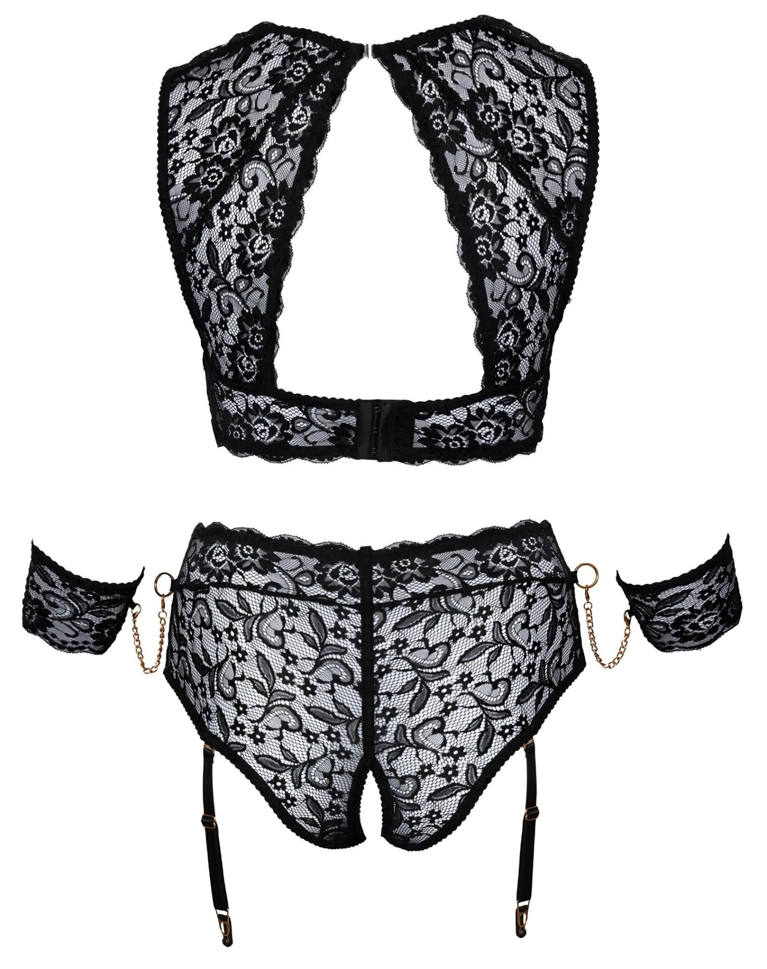 • Accessoires coquins : Le set comprend une paire de menottes en dentelle à scratch et une chaînette avec mousqueton - pour attacher les poignets à la culotte et pimenter vos moments de soumission.