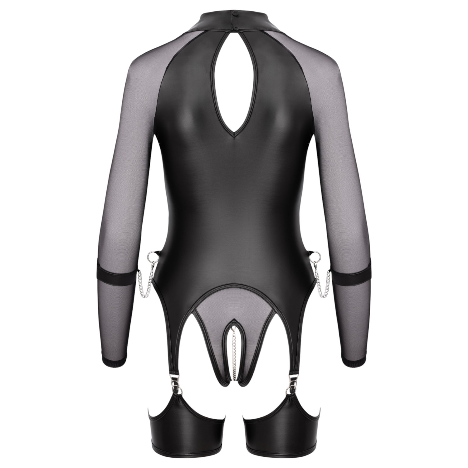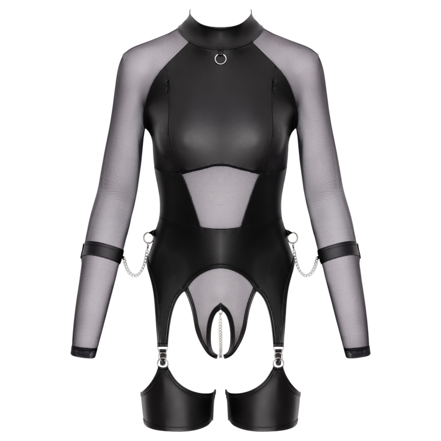 Le haut transparent et brillant de Cottelli Bondage est la parfaite combinaison d’érotisme audacieux et de design sophistiqué. Le body à manches longues, ajusté au corps, est fabriqué à partir d'une combinaison de matériaux transparents et mats qui sont à la fois élégants et provocants. La chaîne amovible au-dessus de l’ouverture intime, les jarretelles amovibles ainsi que les fermetures éclair cachées au niveau de la poitrine garantissent l'excitation. Les menottes douces incluses dans l'ensemble peuvent être attachées aux anneaux situés sur le côté du corps, offrant une expérience de jeu vraiment polyvalente et imaginative.
