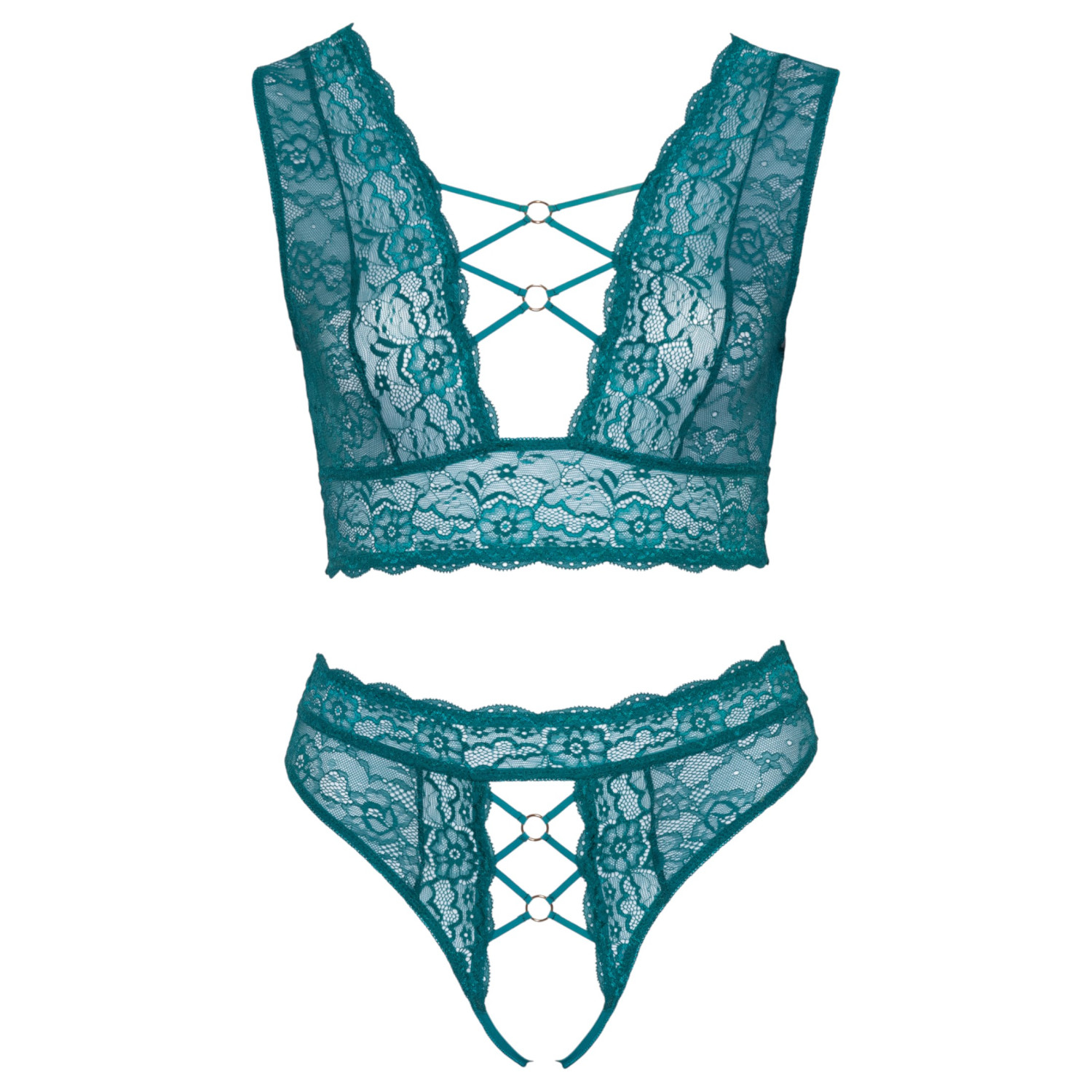 Le set en dentelle à lacets Cottelli Curves est fabriqué à partir de dentelle douce et extensible, s'adaptant parfaitement au corps tout en assurant confort toute la soirée. Le bralette profondément décolleté présente une forme unique et provocante à l'avant et à l'arrière, maintenue par des anneaux dorés rose et des bandes élastiques. La culotte taille haute, ouverte est simplement reliée par des anneaux et des fines bandes à l'avant, offrant une apparence ultra érotique - une véritable pièce de séduction. La dentelle bleu-vert est particulièrement élégante et raffinée, rendant l'ensemble à la fois séduisant et exclusif.