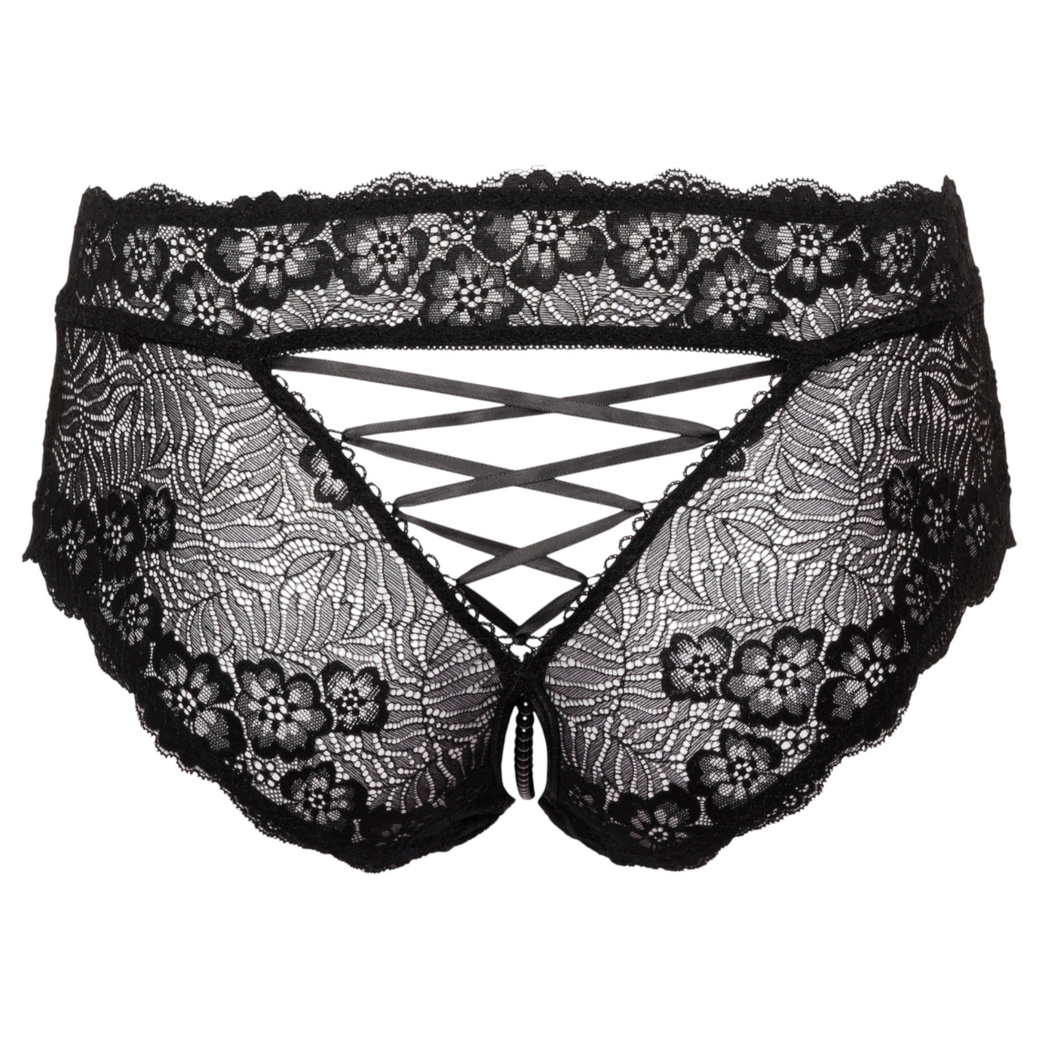 • 1 culotte ouverte en dentelle (noir) avec chaîne de perles stimulante et laçage en satin