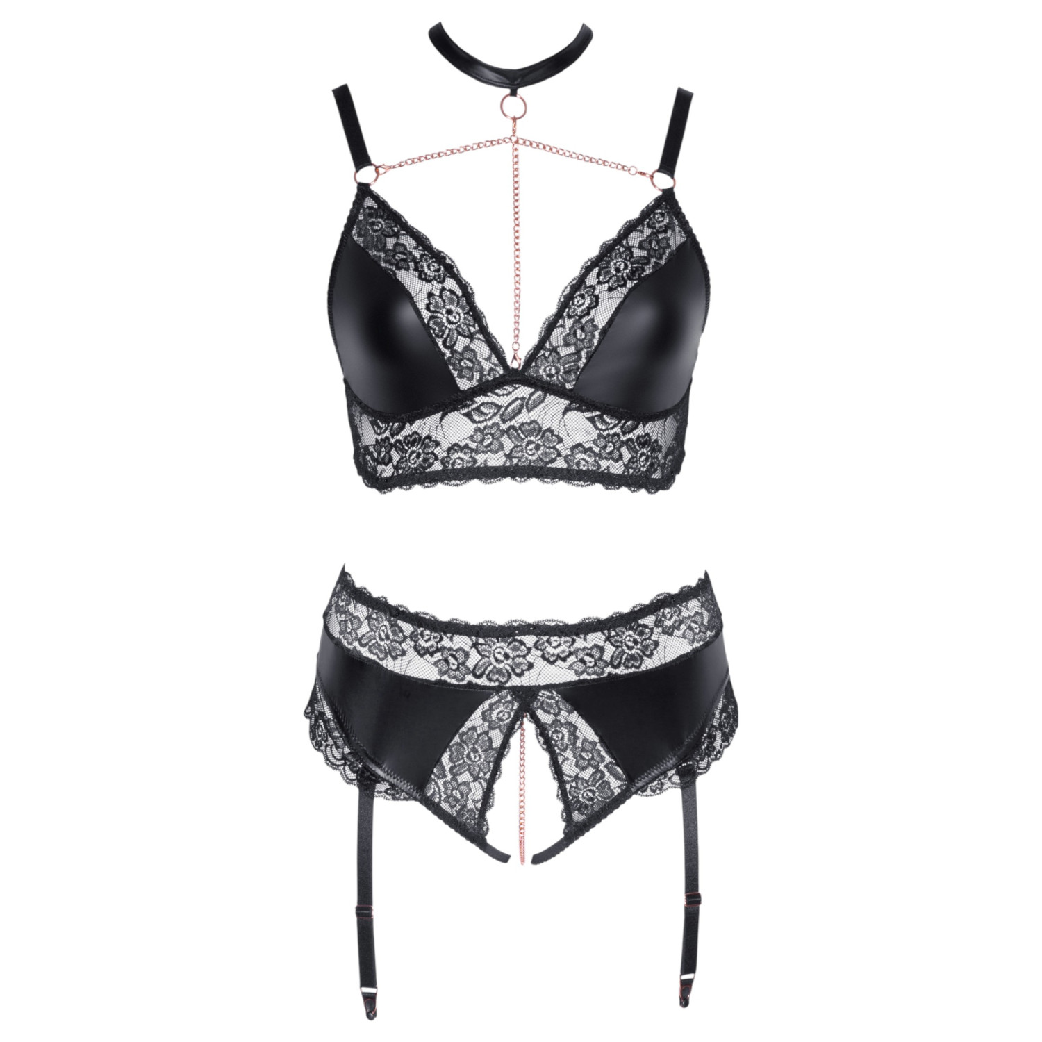 Le Cottelli Curves – ensemble soutien-gorge en dentelle avec chaînes et culotte porte-jarretelles ouverte (noir) est un ensemble de lingerie audacieux, érotique et modifiable, qui combine un matériau à effet mat, de la dentelle, et des accessoires chaînables amovibles pour créer la séduction parfaite.