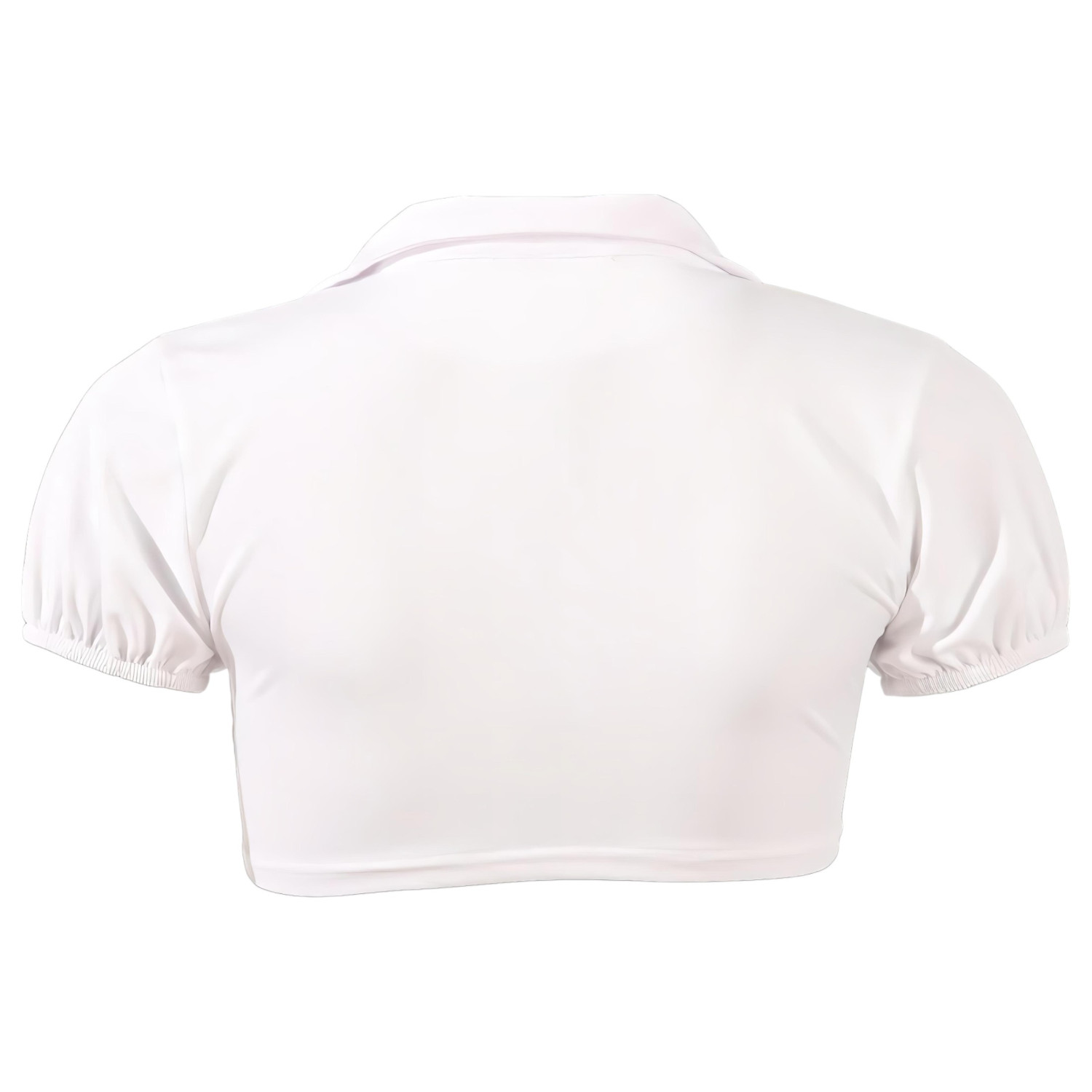 • Top court : Tissu blanc extensible, à nouer devant, avec un décolleté rond très plongeant qui mettra en valeur tes courbes.