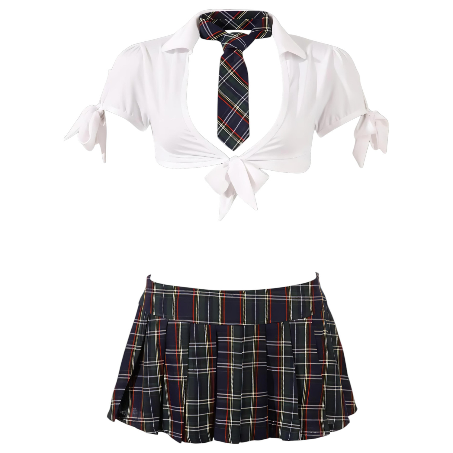 • Détails soignés : La cravate à carreaux et la culotte avec porte-jarretelles ajoutent une touche authentique à la tenue.