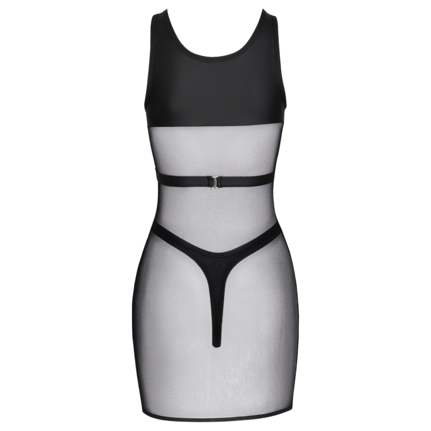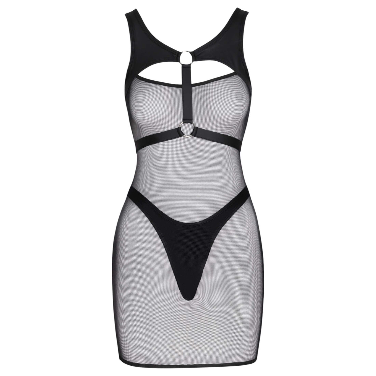 Cette tenue en maille provocante avec string est le choix parfait pour qui souhaite quelque chose de vraiment audacieux. La minirobe ajustée en maille translucide est dotée de bretelles et de panneaux de poitrine brillants agrémentés de anneaux métalliques, créant un effet séduisant mais élégant. Le string taille haute brillant du set souligne les hanches et les fesses. Les matières élastiques garantissent un confort optimal, même pour une nuit entière!
