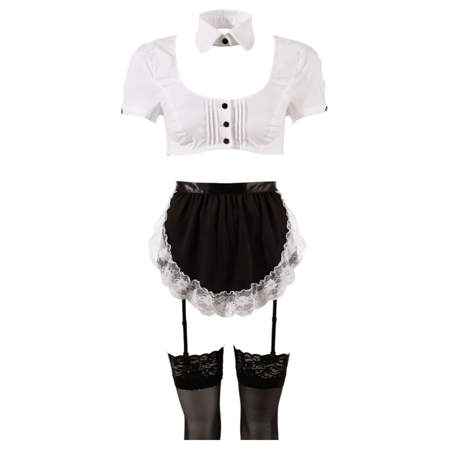 • Bas noirs en dentelle, col à boutons blanc, coiffe avec serre-tête et tablier bordé de dentelle blanche et ceinture en satin noir - tout pour réussir un jeu de rôle complet.