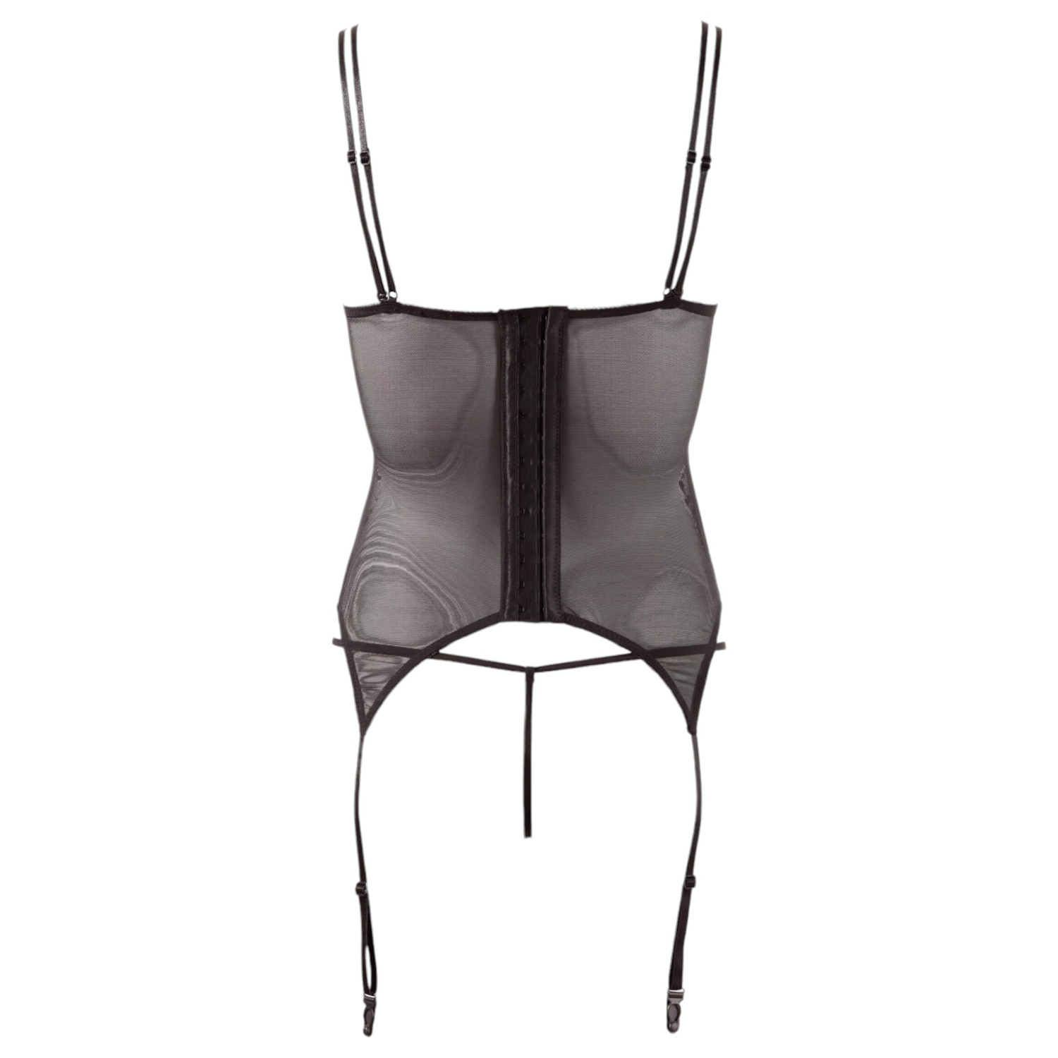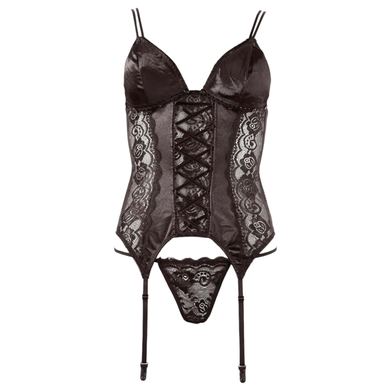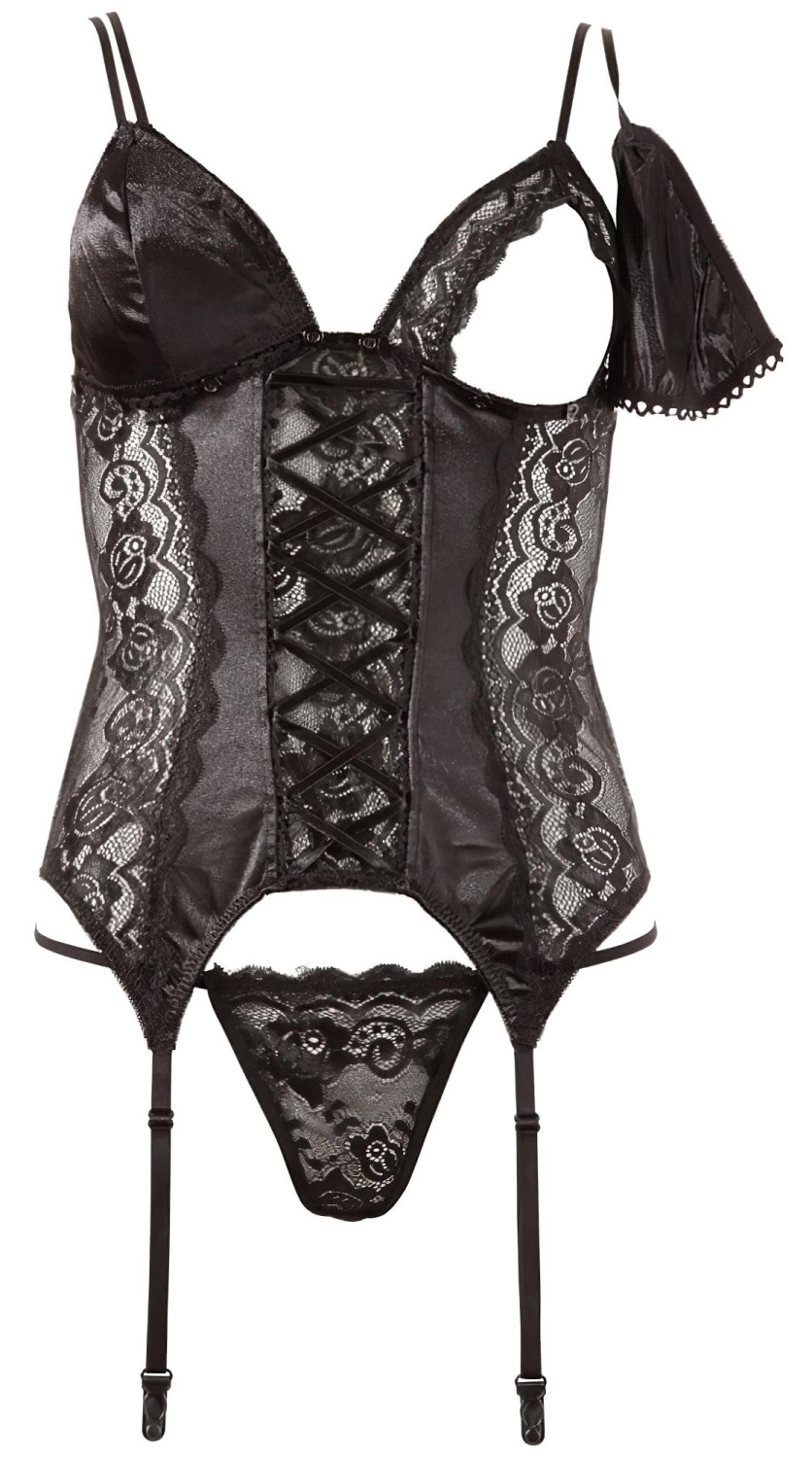 Top avec jarretelles en satin noir brillant et dentelle fine transparente, avec des bretelles doubles et de magnifiques motifs.