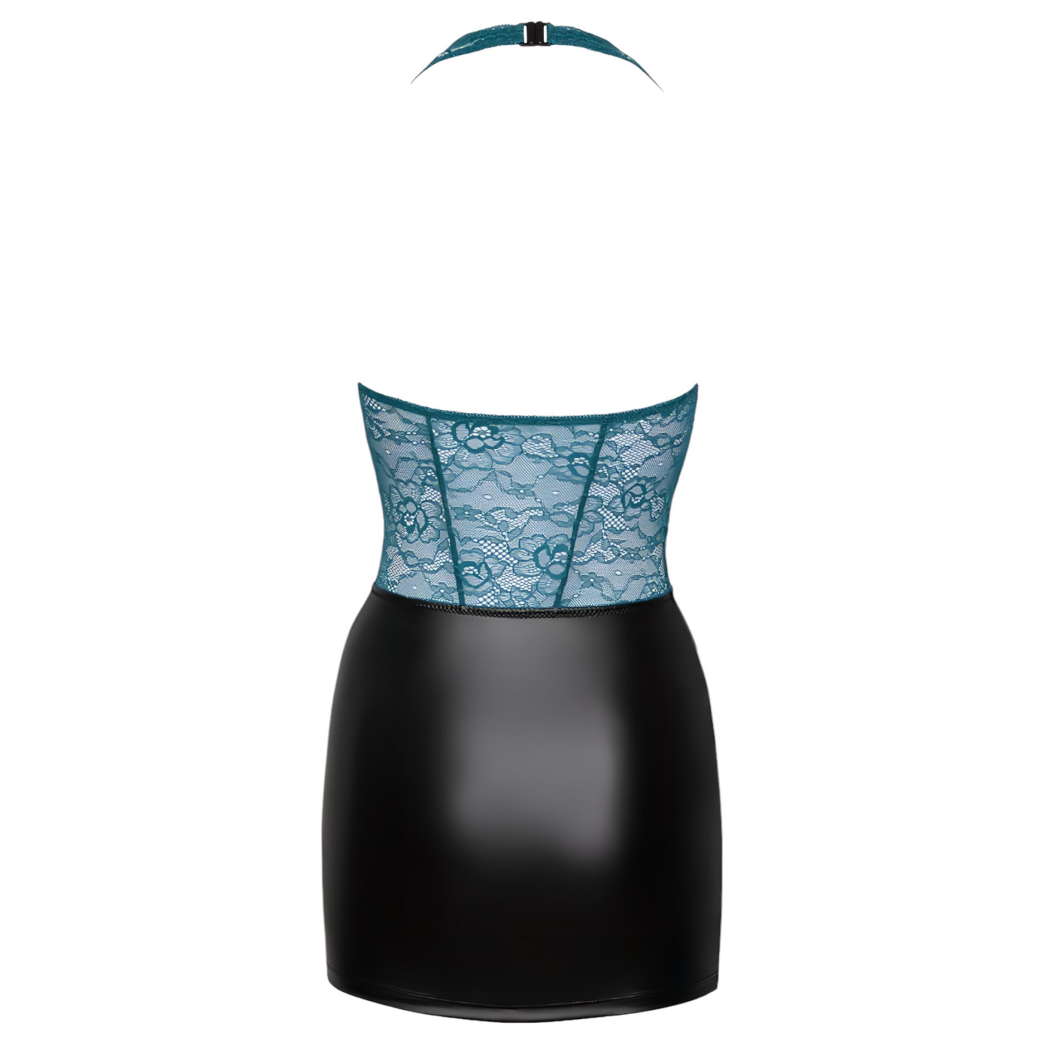 • Design : Coupe moulante, haut en dentelle transparente, jupe mate, décolleté profond avec anneaux métalliques et bretelles extensibles, grand dos nu, tour de cou à clip plastique.
