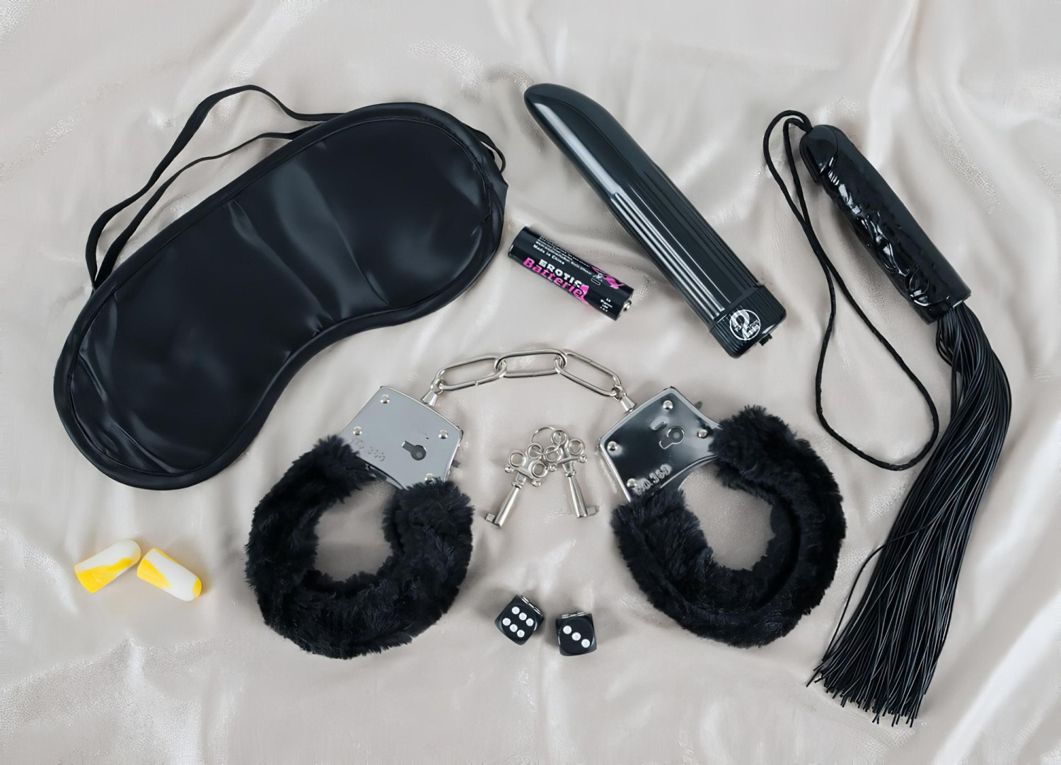 • Accessoires en cadeau - menottes, masque pour les yeux, petit fouet et vibromasseur - tout pour commencer tout de suite