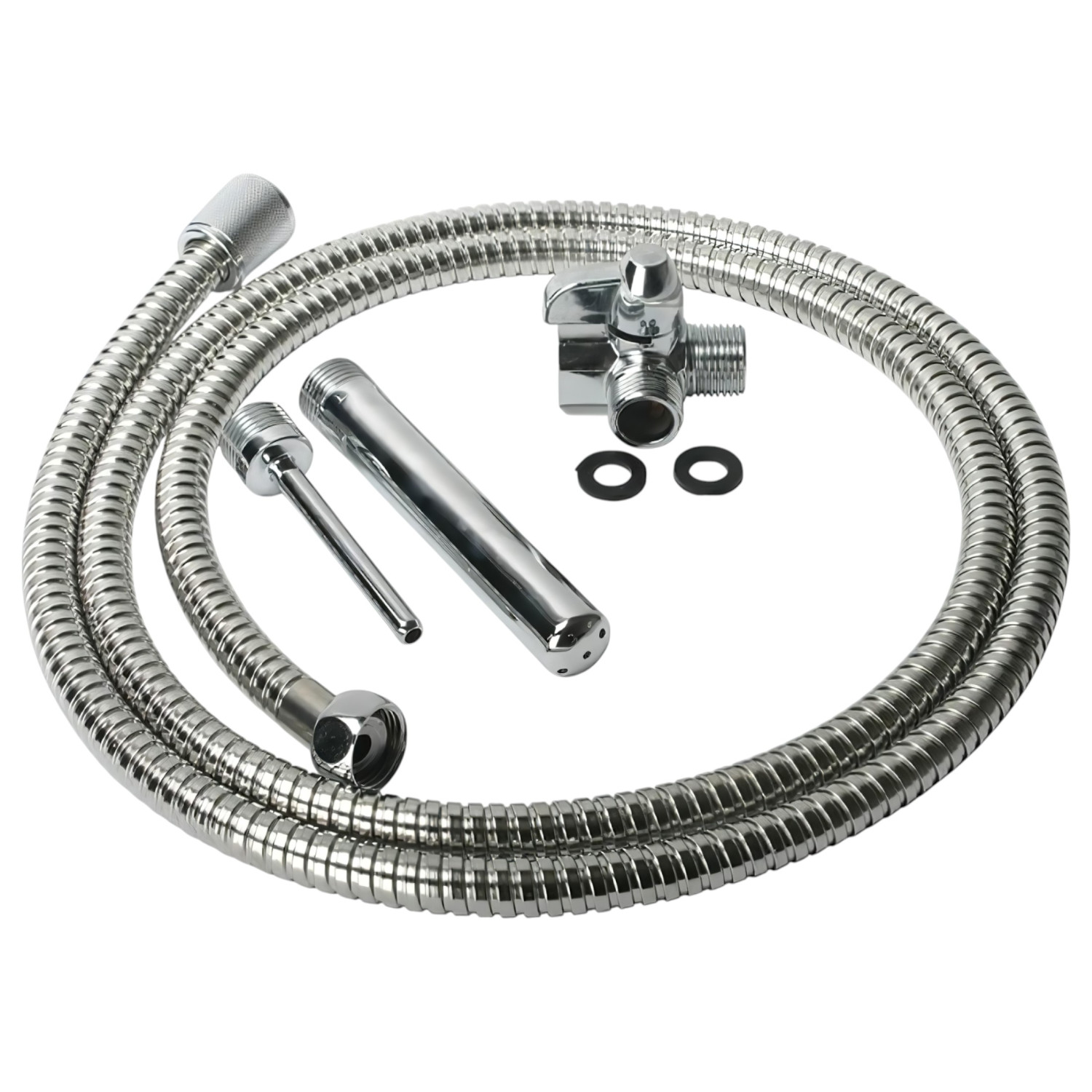• Set complet avec deux embouts de douche interchangeables, un robinet et un long tuyau