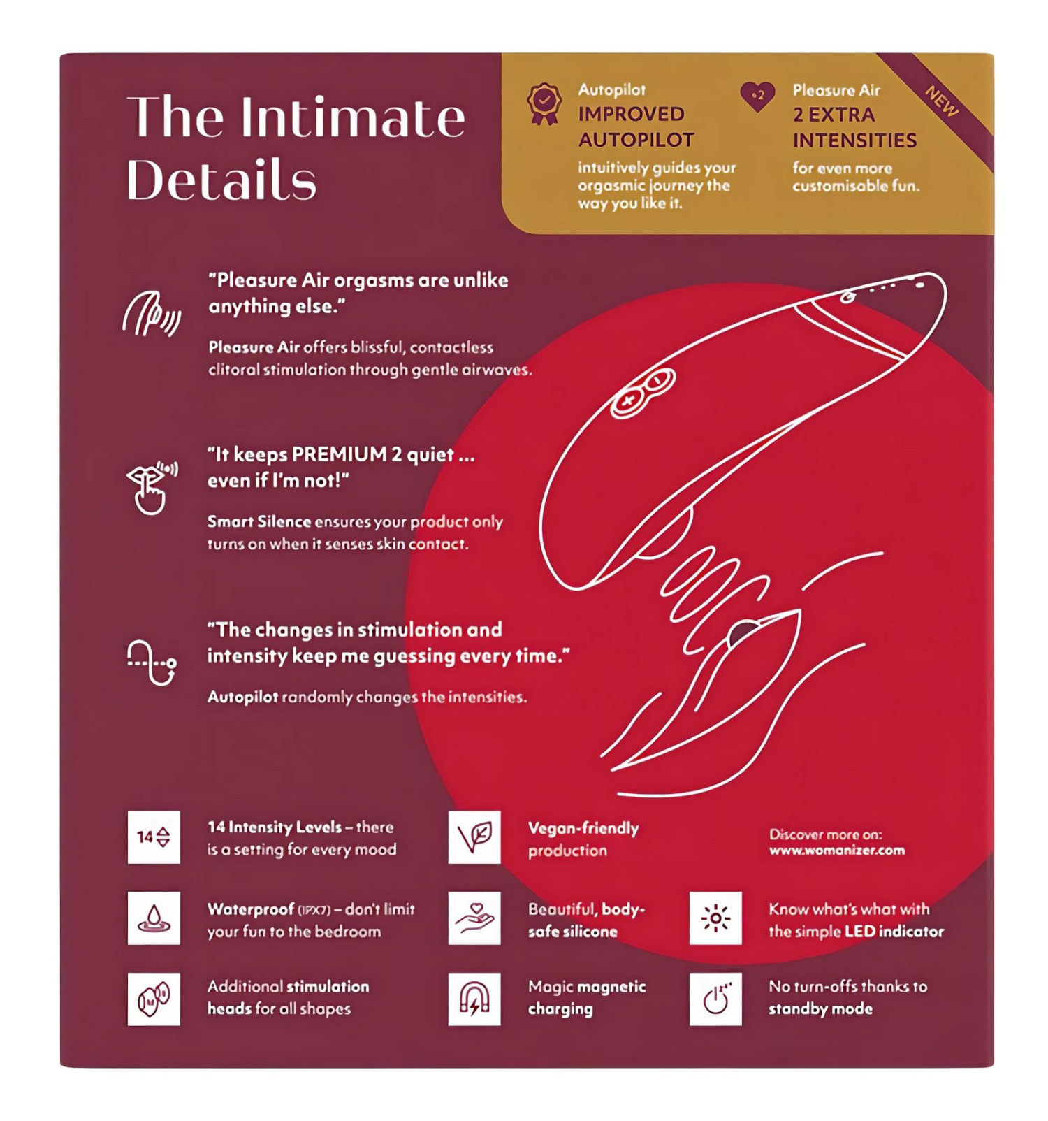 Le Womanizer Premium 2 combine la technologie à ondes de pression la plus avancée, la fonction Smart Silence et le mode Autopilot, offrant ainsi une expérience unique et inoubliable à chaque utilisation.