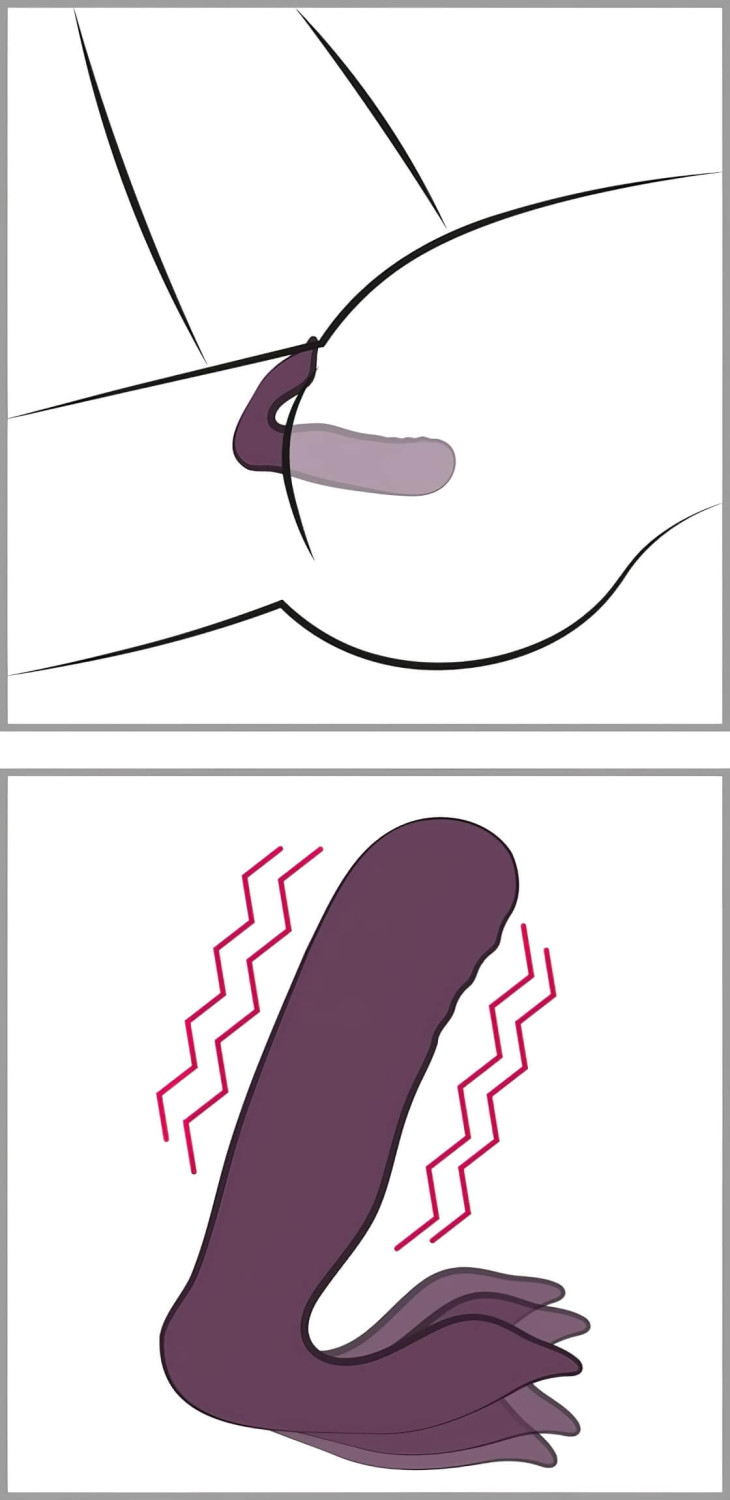 Insère la tige plus longue dans le vagin, la tête tournée vers le haut et vers toi. La partie externe à double oreilles vient se poser sur le clitoris. Important : avant de porter le jouet, allume-le en maintenant le bouton enfoncé longuement.