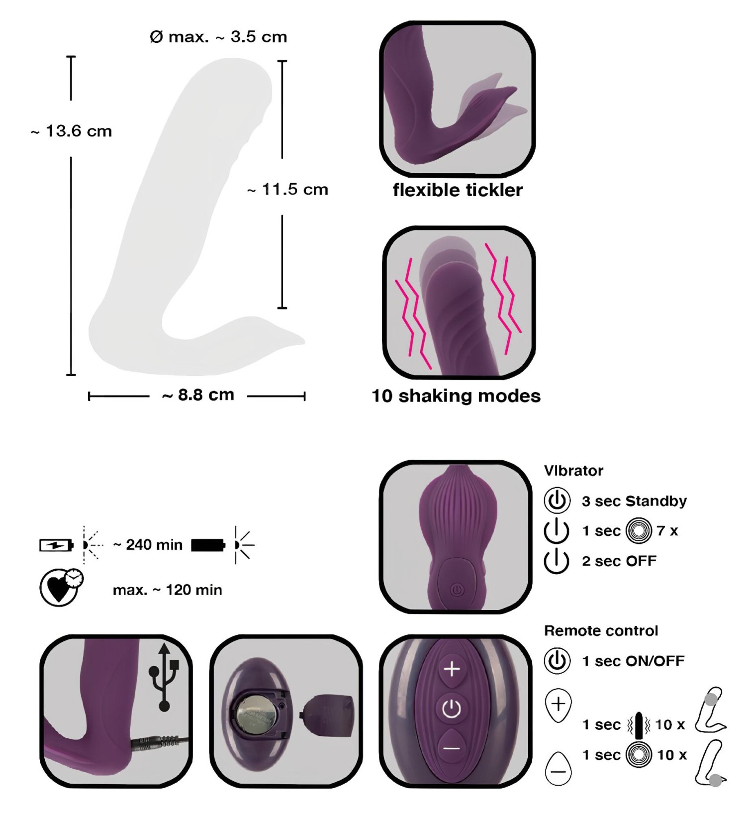 • Télécommande sans fil - contrôle jusqu’à 10 mètres, à passer à ton/ta partenaire si tu veux