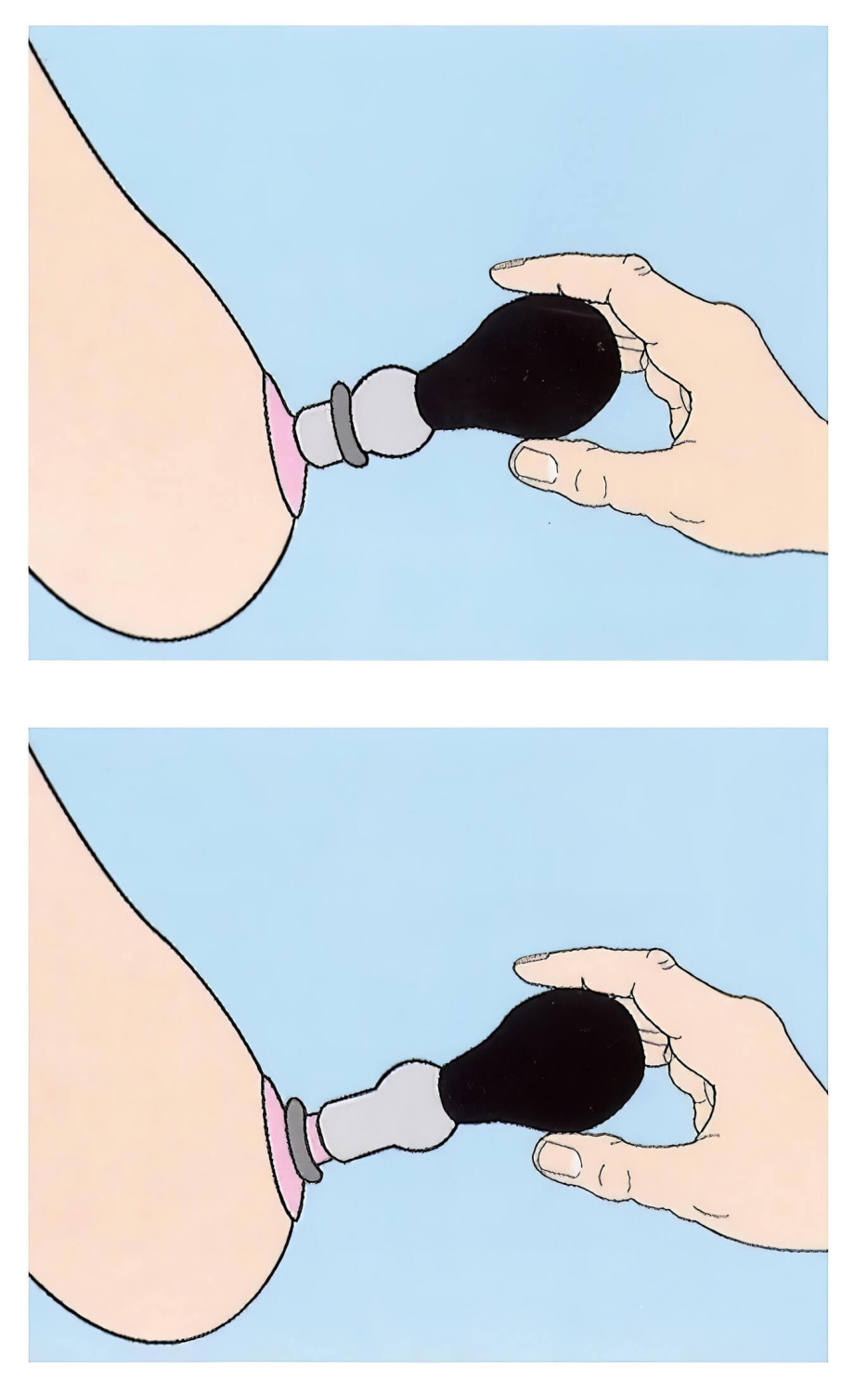• Pour retirer les cloches, pressez-les à nouveau avec vos doigts pour relâcher le vide. Pendant que le vide aspire votre téton, déroulez l'anneau de fixation déjà en place sur le bec pour maintenir la fermeté de votre téton.