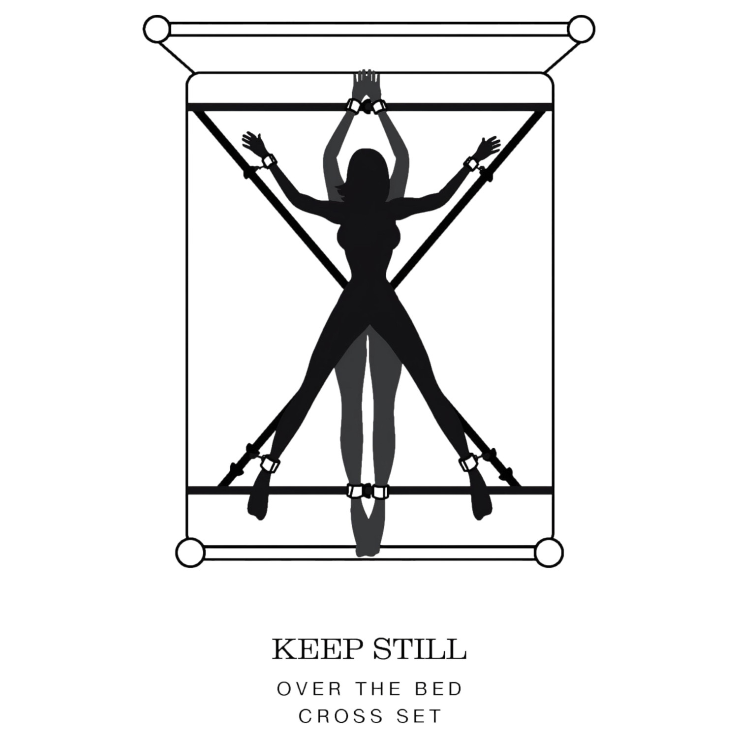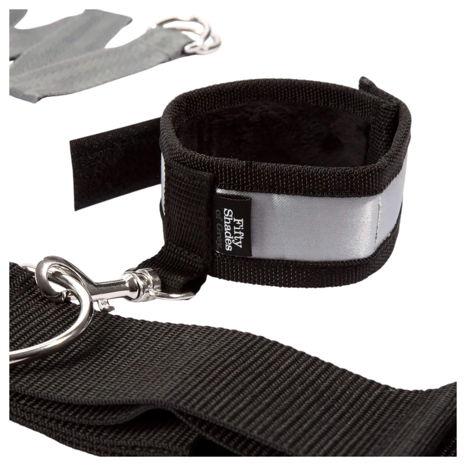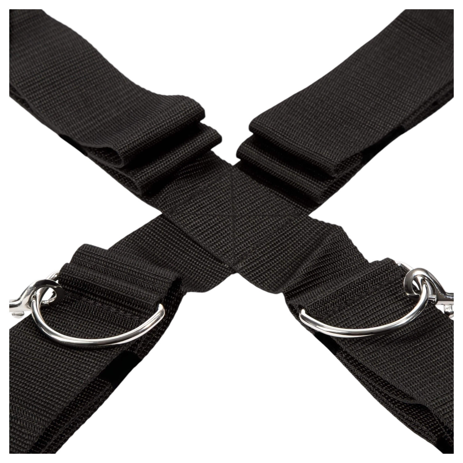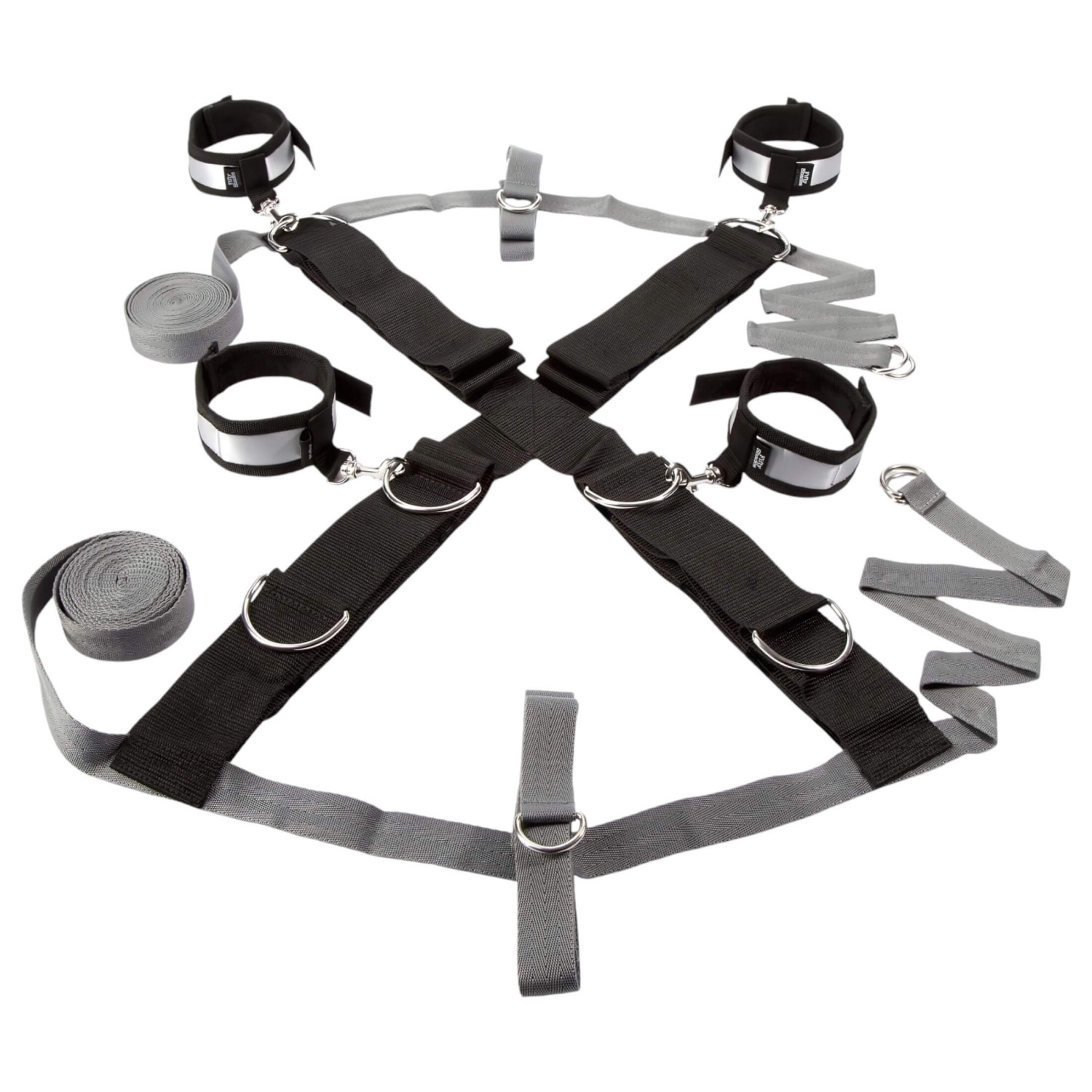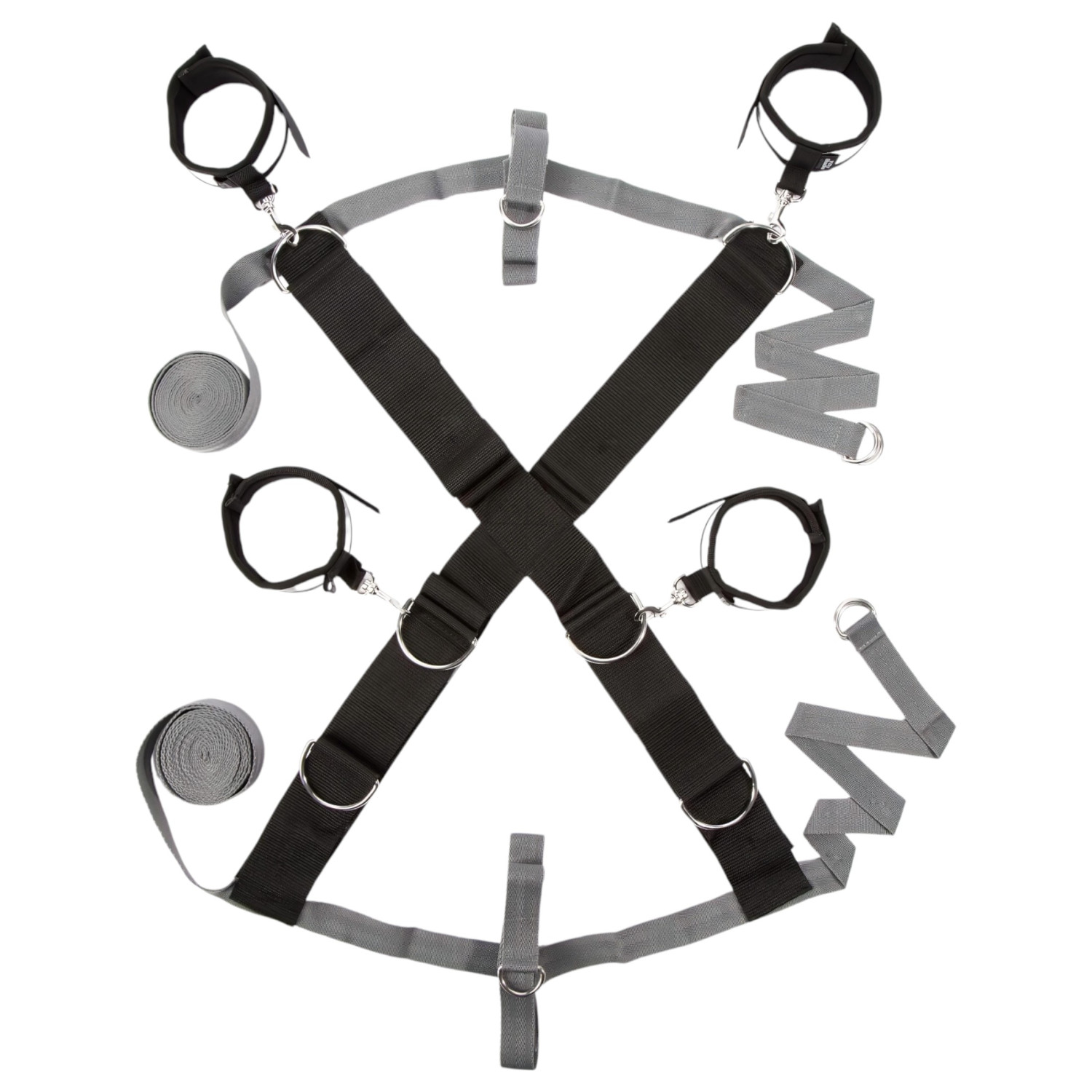Passe la sangle croisée sous le matelas, puis attache les longues sangles grises de chaque côté pour créer la configuration de ton choix. Ajuste les menottes pour poignets et chevilles grâce à leur scratch, fixe-les à l’aide des petits mousquetons. Pour pimenter le jeu, mets le masque sur les yeux de ton/ta partenaire et laissez-vous emporter par des sensations inédites.