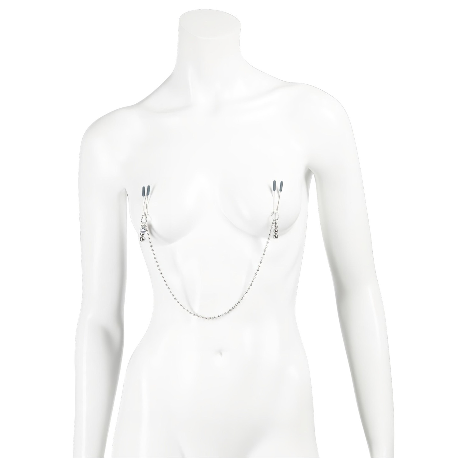 • Place les pinces sur les tétons et ajuste la pression avec les petits anneaux selon tes envies.