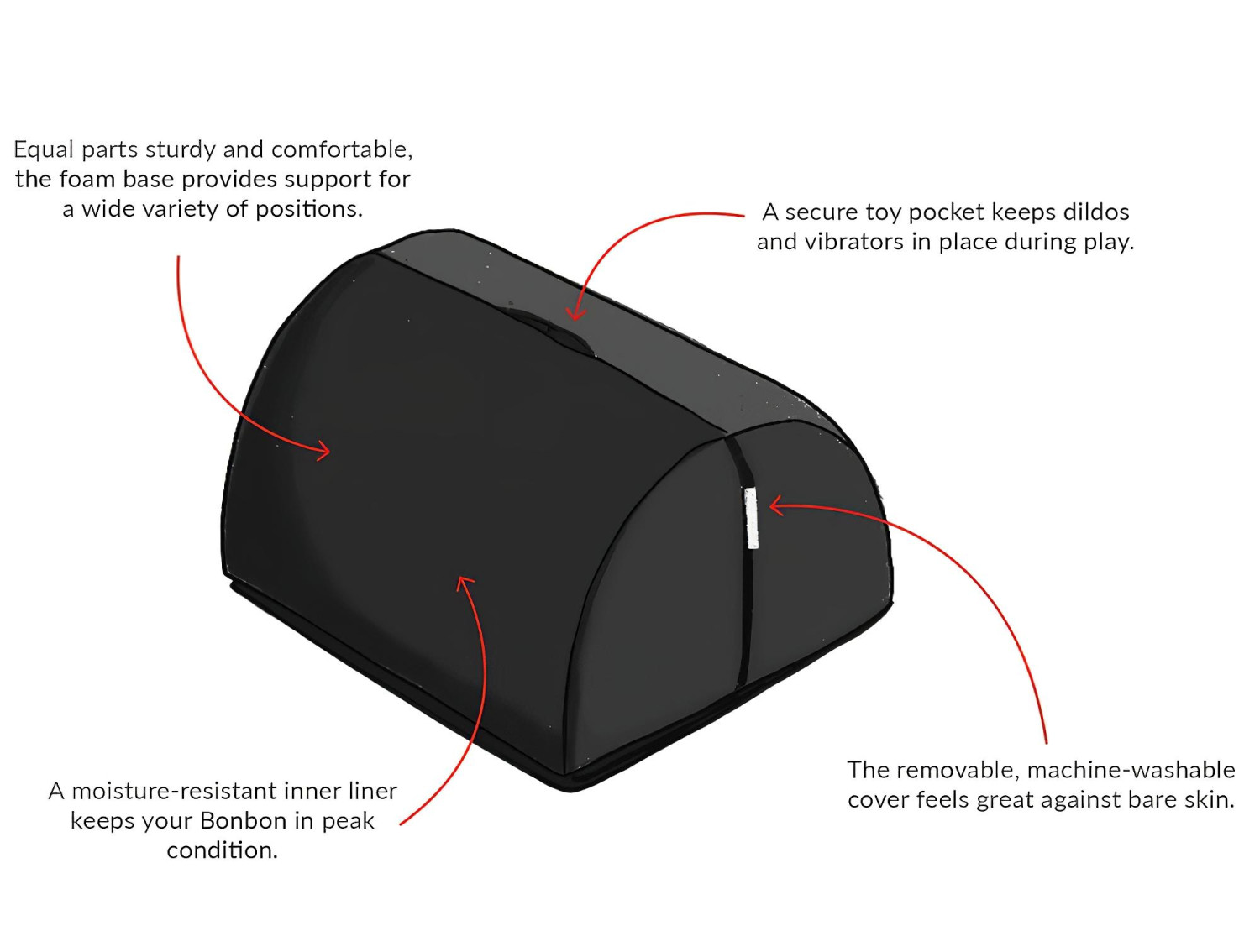 • Forme demi-lune ergonomique : assure une posture optimale dans de multiples positions, surélève les hanches et facilite la stimulation du point G.