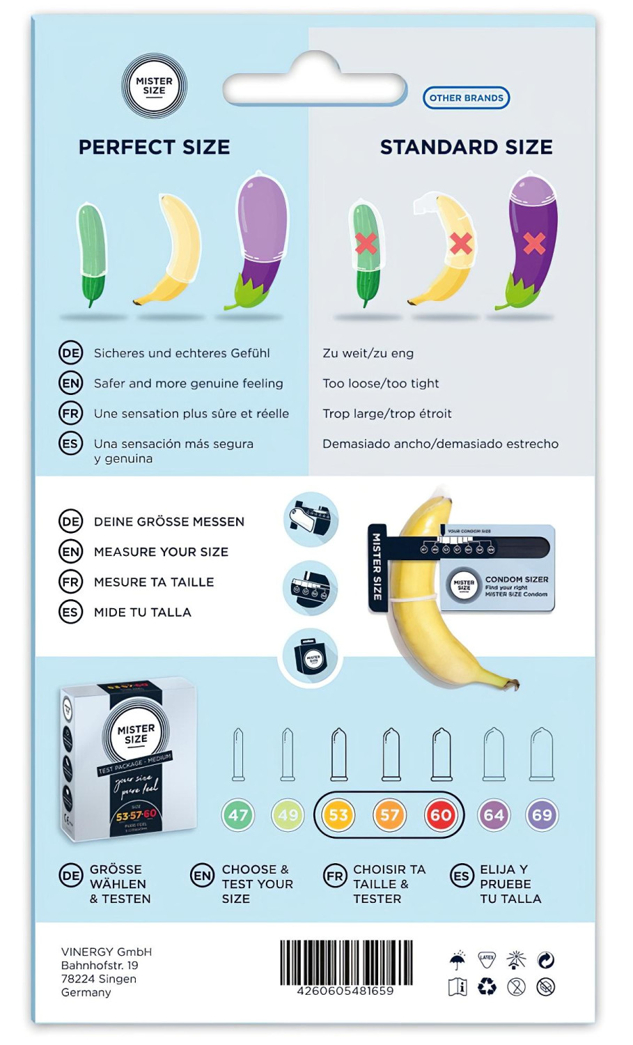 • 1 préservatif Mister Size - 60 mm de large (pour un tour de pénis de 13,5 à 14,5 cm)