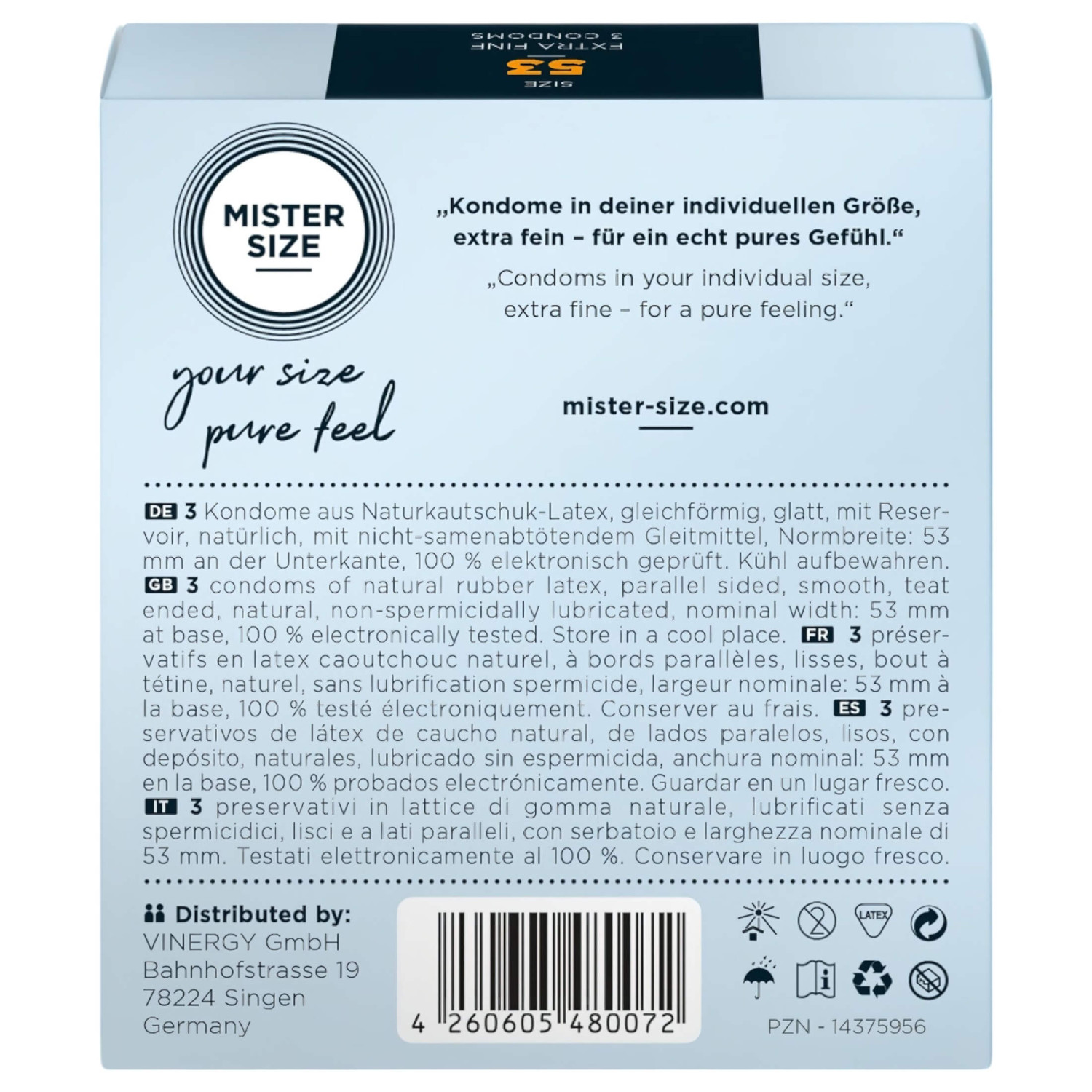 • 3 préservatifs Mister Size 53 mm, emballés individuellement.