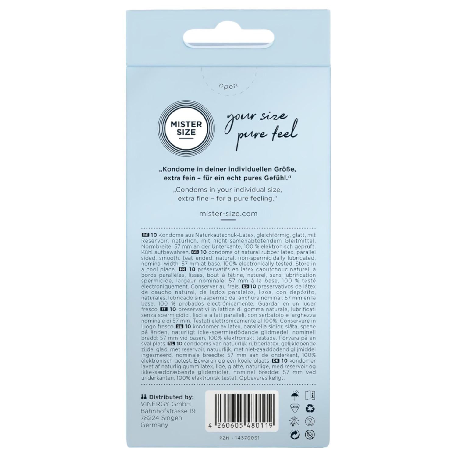 • 10 préservatifs Mister Size 57 mm, ultra-fins, lubrifiés, emballés individuellement.