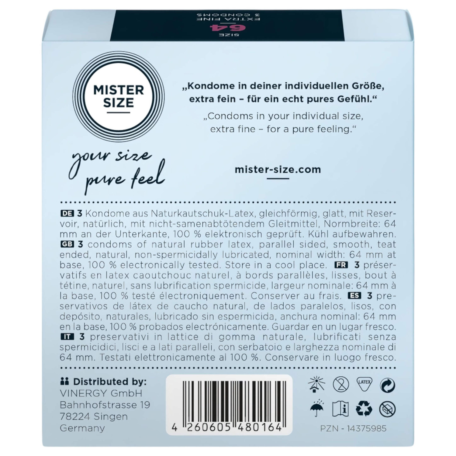 • 3 préservatifs Mister Size 64 mm, ultra-fins, lubrifiés et emballés individuellement.