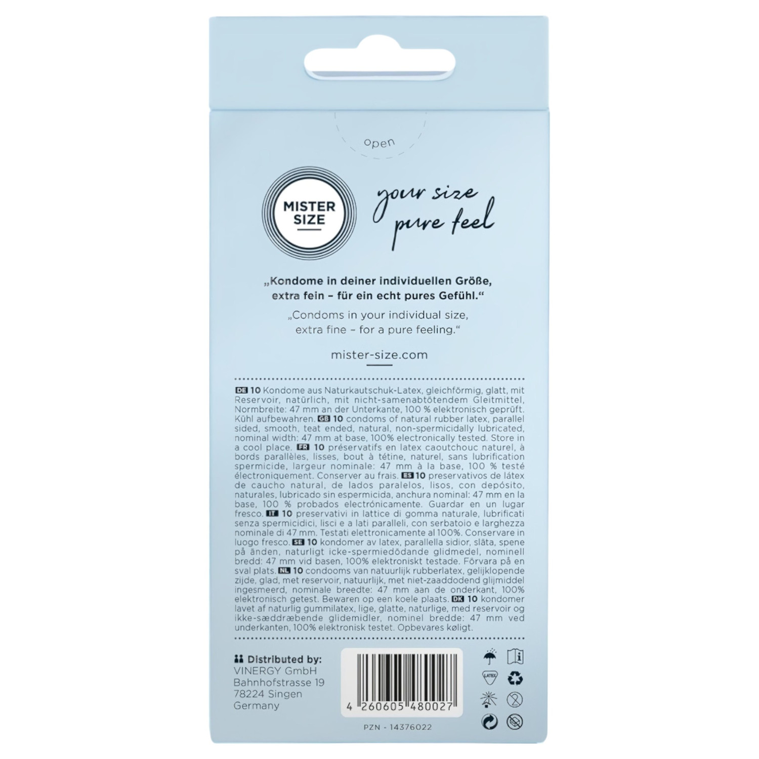 • 10 préservatifs Mister Size, 47 mm, extra fins et lubrifiés, emballés individuellement.
