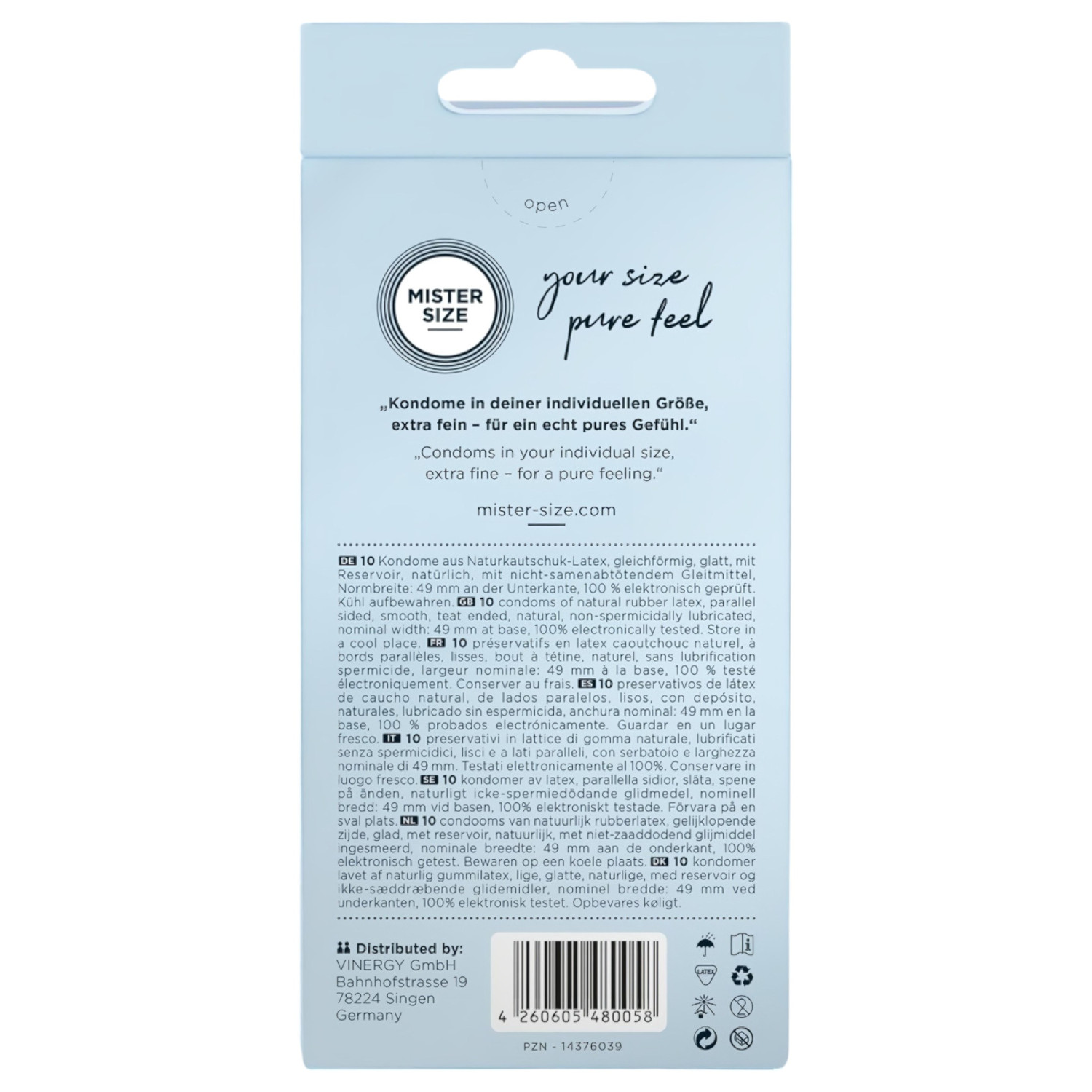 • 10 préservatifs Mister Size de 49 mm, emballés individuellement.