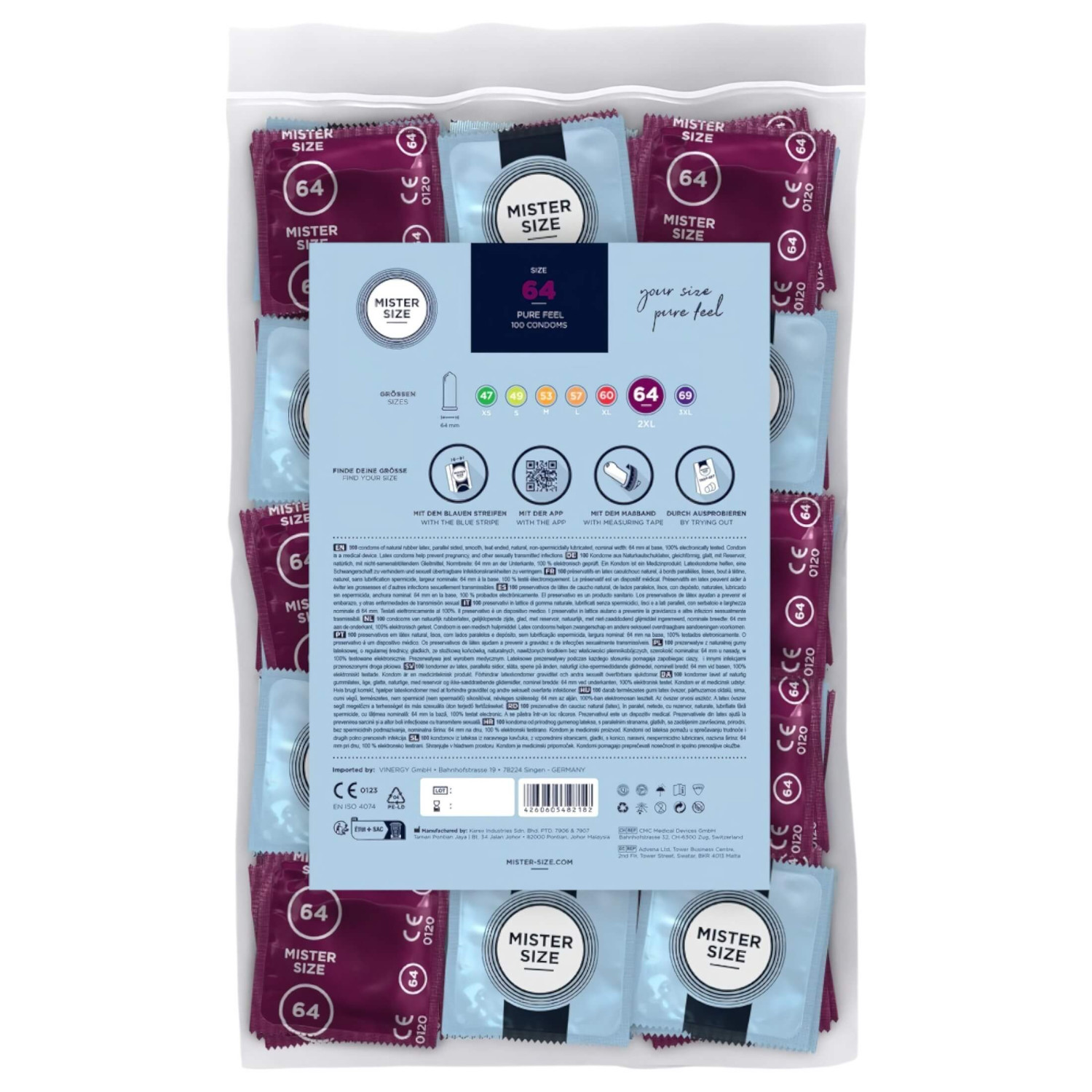 • 100 préservatifs Mister Size de 64 mm, ultra fins, lubrifiés, emballés individuellement.