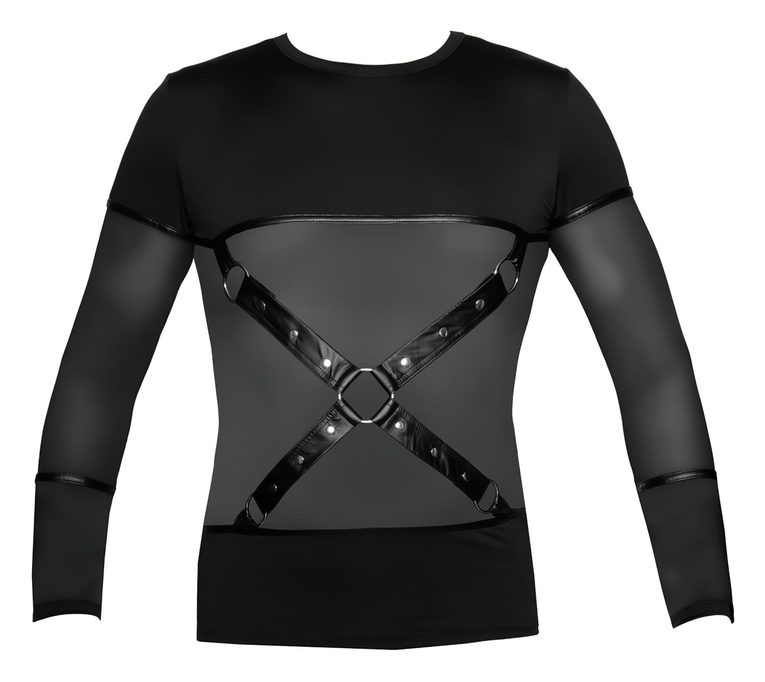 Haut pour homme sexy, au toucher soyeux, avec bretelles croisées et détails en résille transparente.