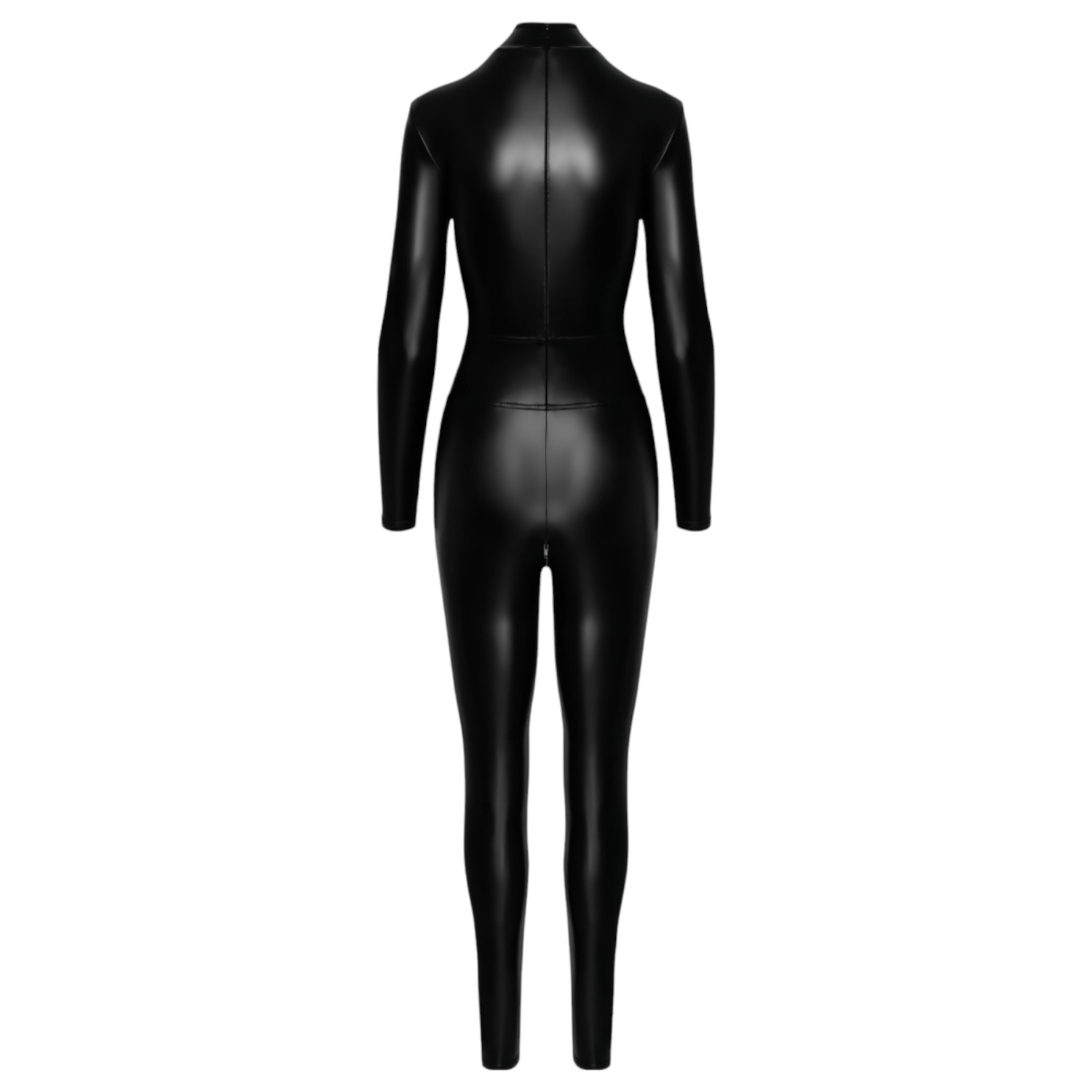 Combinaison longue sexy qui couvre tout le corps, avec une grande fermeture éclair et un large anneau décoratif sur le ventre.
