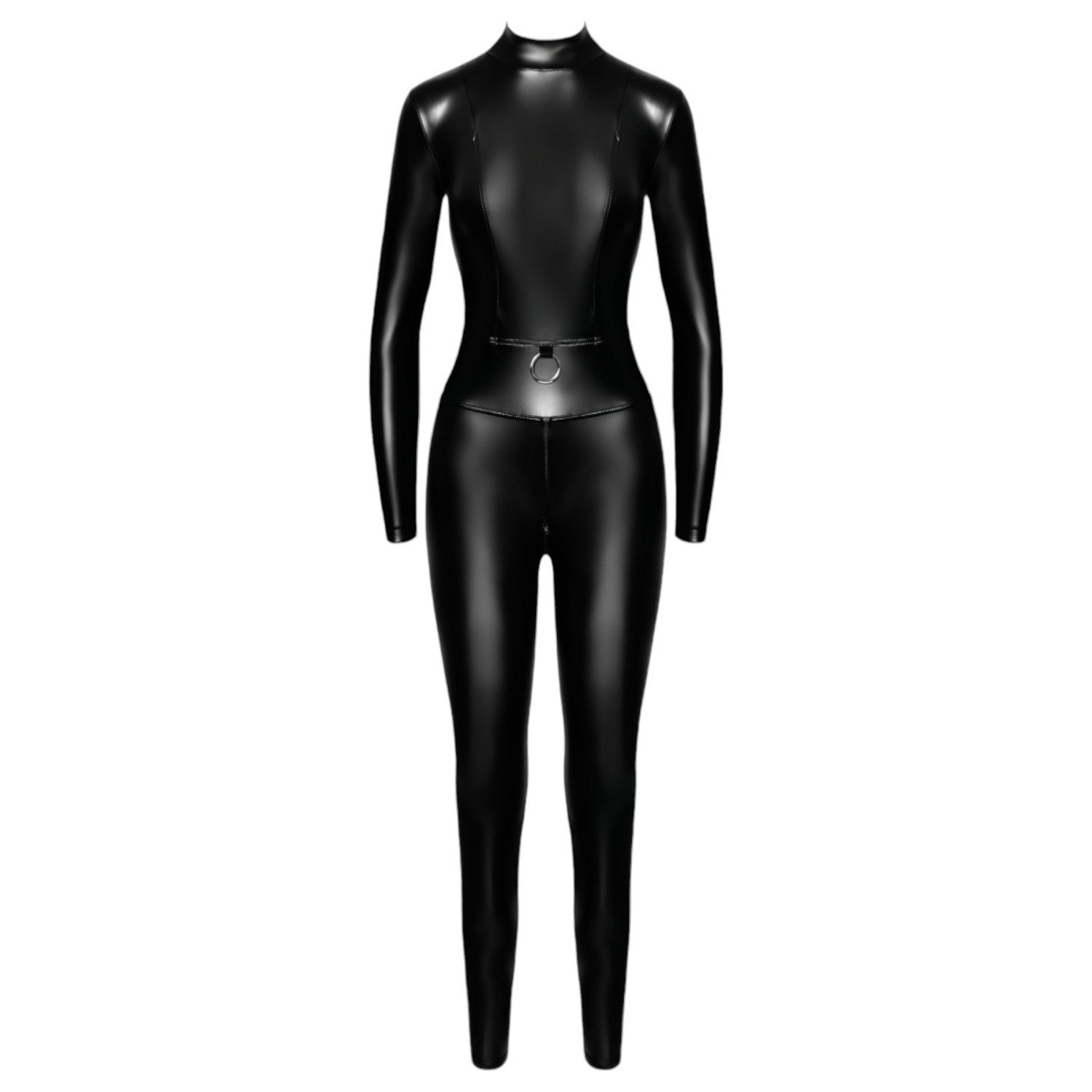 Combinaison longue sexy qui couvre tout le corps, avec une grande fermeture éclair et un large anneau décoratif sur le ventre.