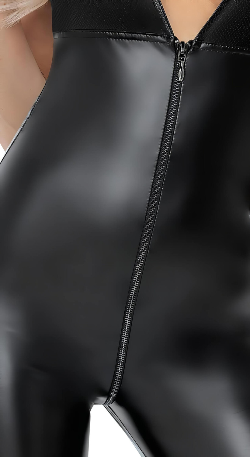 Combinaison brillante à décolleté extra-profond, idéale pour un costume de Catwoman ou une tenue de Domina!