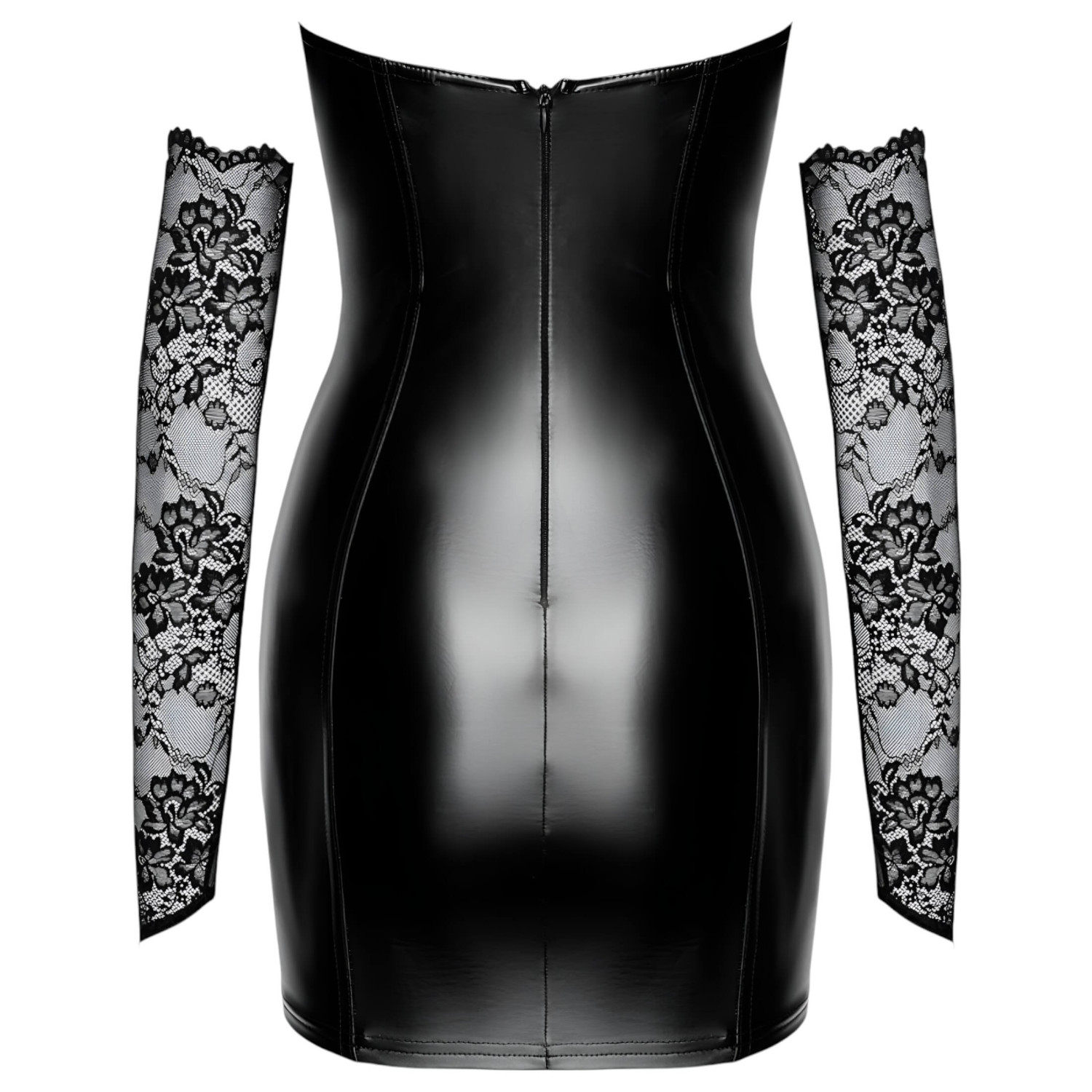 Découvre le magnifique ensemble de Noir Handmade, composé d'une mini-robe bustier moulante et de manchettes en dentelle assorties.
